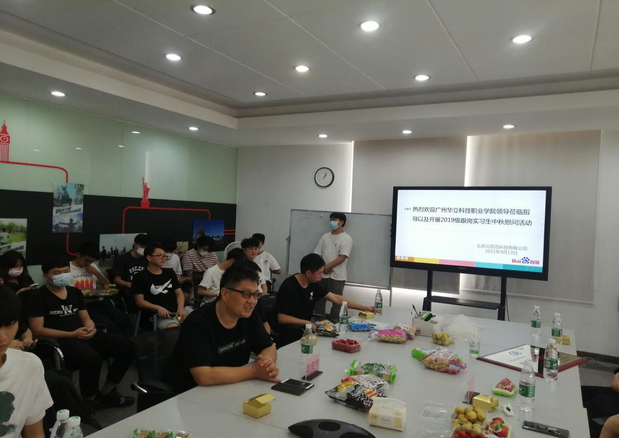 9月13日,中秋佳節(jié)之際,廣州華立科技職業(yè)學(xué)院黨委書記林偉健,計算機(jī)信息工程學(xué)院院長王建華、校外教學(xué)副主任蔡文欽、校外干事黃志強(qiáng)老師一行到北京云百訊科技有限公司佛山分公司看望2019級65位在跟崗實習(xí)的學(xué)生,開展中秋節(jié)慰問活動。
