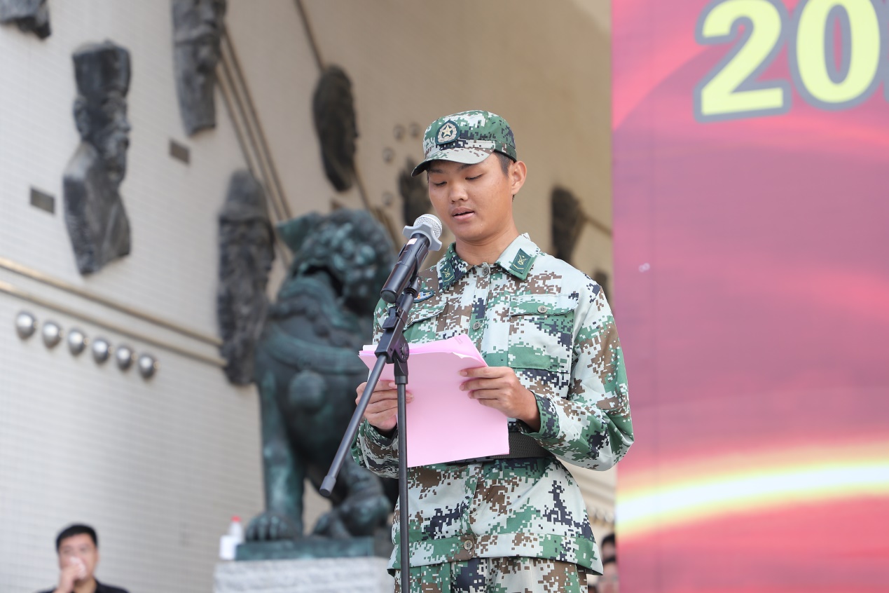 會(huì)上,廣州增城區(qū)武裝部鄧偉健主任表示同學(xué)們通過10多天的軍訓(xùn)對(duì)軍隊(duì)歷史和無私奉獻(xiàn)的精神有一定的了解體會(huì),希望大家繼續(xù)秉承艱苦奮斗,頑強(qiáng)拼搏的精神認(rèn)真學(xué)習(xí),真正成為一名有理想、有道德、有文化、有紀(jì)律的高素質(zhì)復(fù)合型人才。