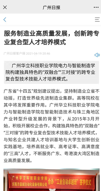 幾年來,學(xué)校高度重視推進《深化新時代教育評價改革總體方案》,堅持立德樹人,牢記為黨育人、為國育才使命,充分發(fā)揮教育評價的指揮棒作用,引導(dǎo)確立科學(xué)的育人目標(biāo)。不以成績論英雄,“以華立不是你的終點,而是你的人生起點”為口號來激勵學(xué)生,同時在德技并修、產(chǎn)教融合、校企合作、育訓(xùn)結(jié)合過程中落實立德樹人根本任務(wù),將習(xí)近平新時代中國特色社會主義思想貫穿技術(shù)技能人才培養(yǎng)全過程。學(xué)習(xí)強國、廣州日報、新華網(wǎng)、廣東科技報等重量級媒體平臺多次重點報道和推廣我校的科-產(chǎn)-教融合育人工作經(jīng)驗。
