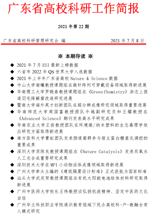 2021年7月8日,由廣東省高??蒲泄芾砭繒斫逃龔d科研處發(fā)布的《廣東省高??蒲泄ぷ骱唸蟆罚?/span>2021年第22期)重點報道了我???/span>-產(chǎn)-教融合育人研究成果,同專欄報道的我校是唯一的省內(nèi)高職院校。
