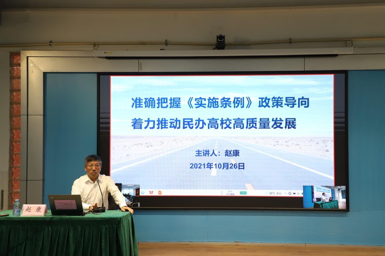 10月26日上午,廣東省民辦教育協(xié)會(huì)會(huì)長(zhǎng),原省教育廳巡視員、黨組成員趙康教授蒞臨我校,以“準(zhǔn)確把握《實(shí)施條例》政策導(dǎo)向著力推動(dòng)民辦高校高質(zhì)量發(fā)展”為主題做專題報(bào)告。校長(zhǎng)劉莊、執(zhí)行校長(zhǎng)馬龍海等校領(lǐng)導(dǎo)班子成員及全??萍?jí)以上干部、系主任參加了此次報(bào)告會(huì),云浮校區(qū)通過視頻連線參加會(huì)議。會(huì)議由學(xué)校黨委書記林偉健主持。