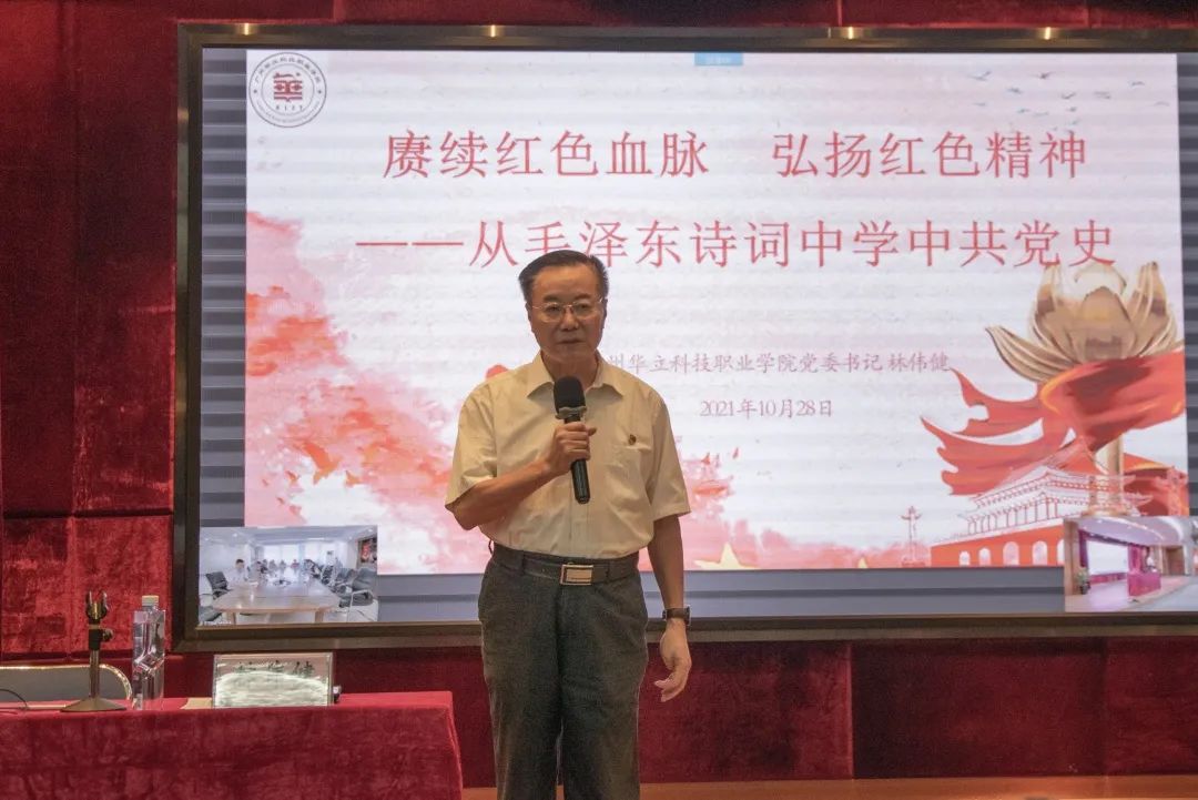10月28日下午,廣州華立科技職業(yè)學院黨委書記林偉健教授在東區(qū)1號報告廳講授“思政第一課”,解讀毛主席詩詞,領悟由建黨精神構建的中國共產黨人的精神譜系及詩詞中蘊含的紅色精神,要求華立學子秉承革命先輩遺志, 弘揚紅色精神,踐行初心使命,樹立為黨為國為民永久奮斗、赤誠奉獻的堅定理想。學校全體黨務干部、思政教師、入黨積極分子和學生參加學習,云浮校區(qū)師生在線上參加會議。省教育工委黨史學習教育第七巡回指導組成員以視頻方式參會指導。