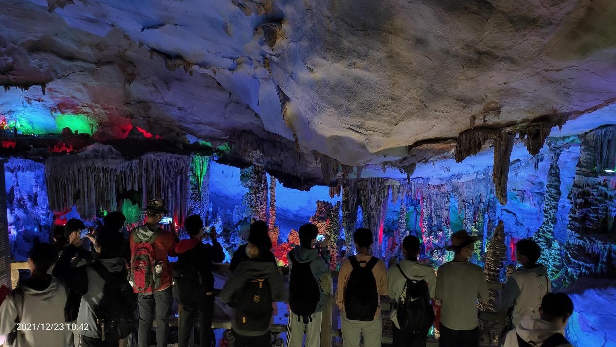 (學生在溶洞中觀察石鐘乳、石筍、石柱等巖溶地貌)