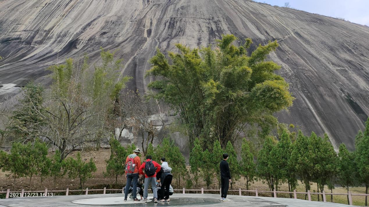 動員會結(jié)束后,實習學生在帶隊老師的組織下有序前往此次野外實習目的地開展地質(zhì)認知實習。出發(fā)前,帶隊老師指導學生學習野簿記錄和羅盤使用的方法。在野外,大家攀登北嶺山和將軍山森林公園,沿路觀察沉積地層和沉積構(gòu)造,了解砂質(zhì)板巖、糜棱巖等變質(zhì)巖的變質(zhì)特征;俯瞰西江,觀察河流的地貌沖蝕(河谷、河床)和堆積地貌(河漫灘、河流階地),學習探討河流堆積物的巖性、結(jié)構(gòu)和構(gòu)造特點,掌握河流的地質(zhì)作用;近觀蟠龍洞,認識巖溶地貌的類型,探究石筍、石柱形成機理,分析地下水地質(zhì)作用和巖溶地貌的成因及影響因素;走進封開國家地質(zhì)公園,實地探尋燕山期花崗巖構(gòu)成的巨大圓丘形地貌景觀,了解古生代碳酸鹽巖巖溶地貌景觀和新構(gòu)造運動產(chǎn)生的多級河流階地與多層水平溶洞地質(zhì)現(xiàn)象。壯美的山川地質(zhì)景觀,不僅增長了實習學生的專業(yè)見識,也提高學生對地礦、水文專業(yè)的認知能力,激發(fā)了他們的學習興趣和熱情。