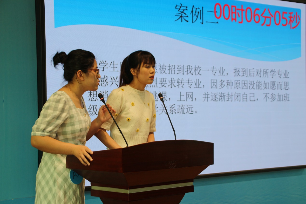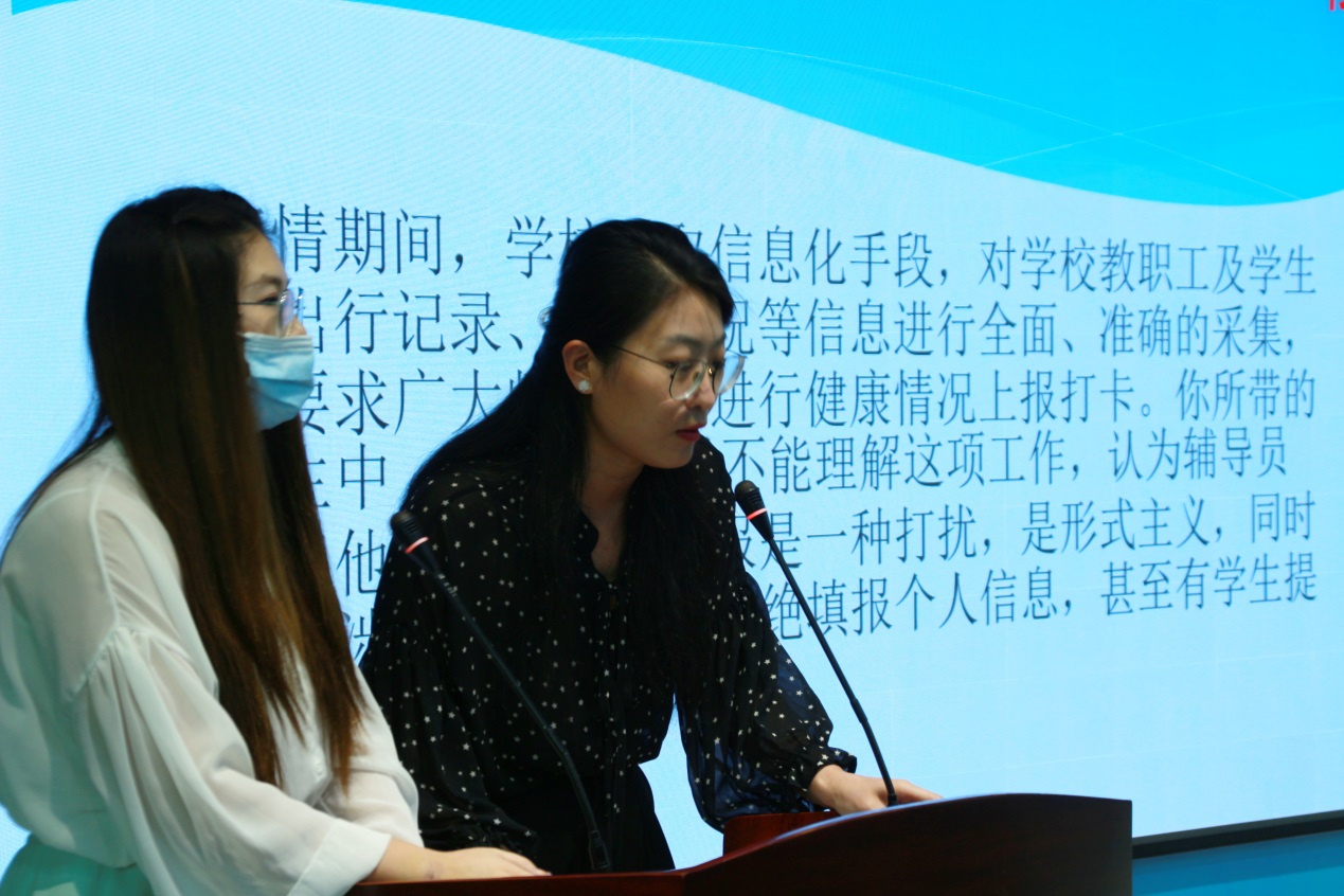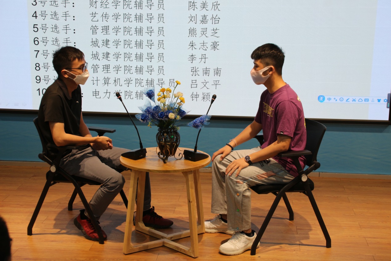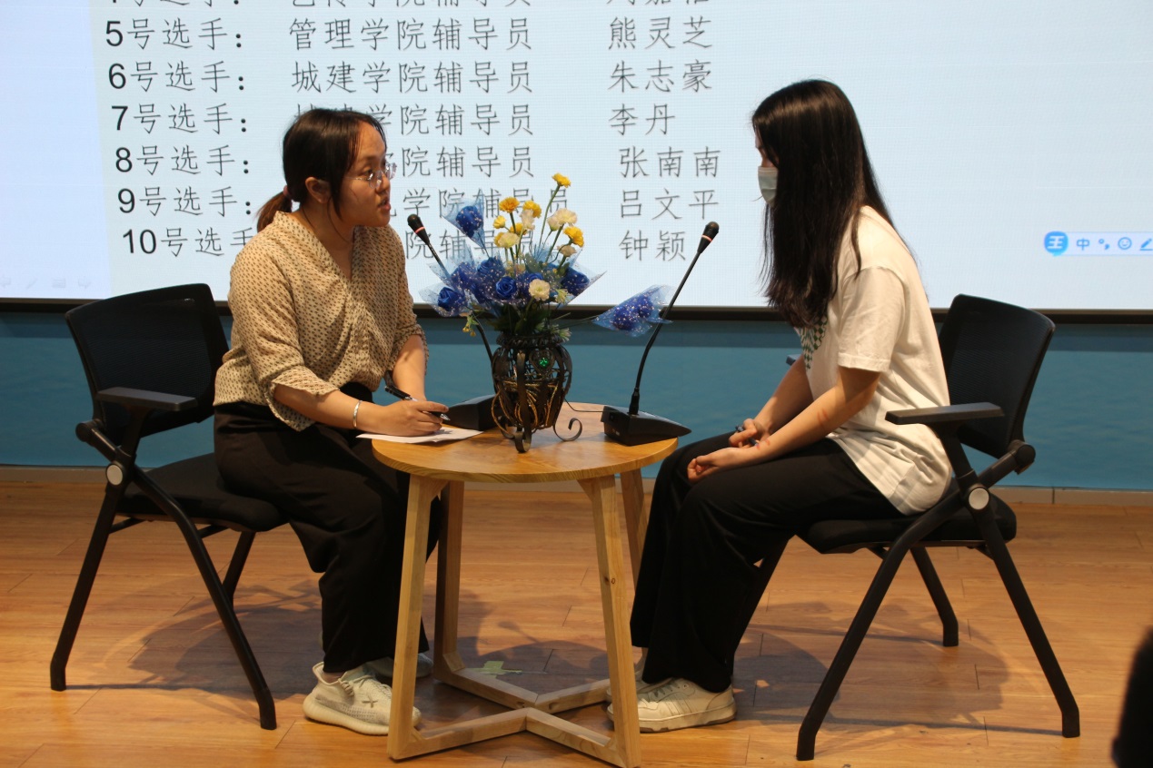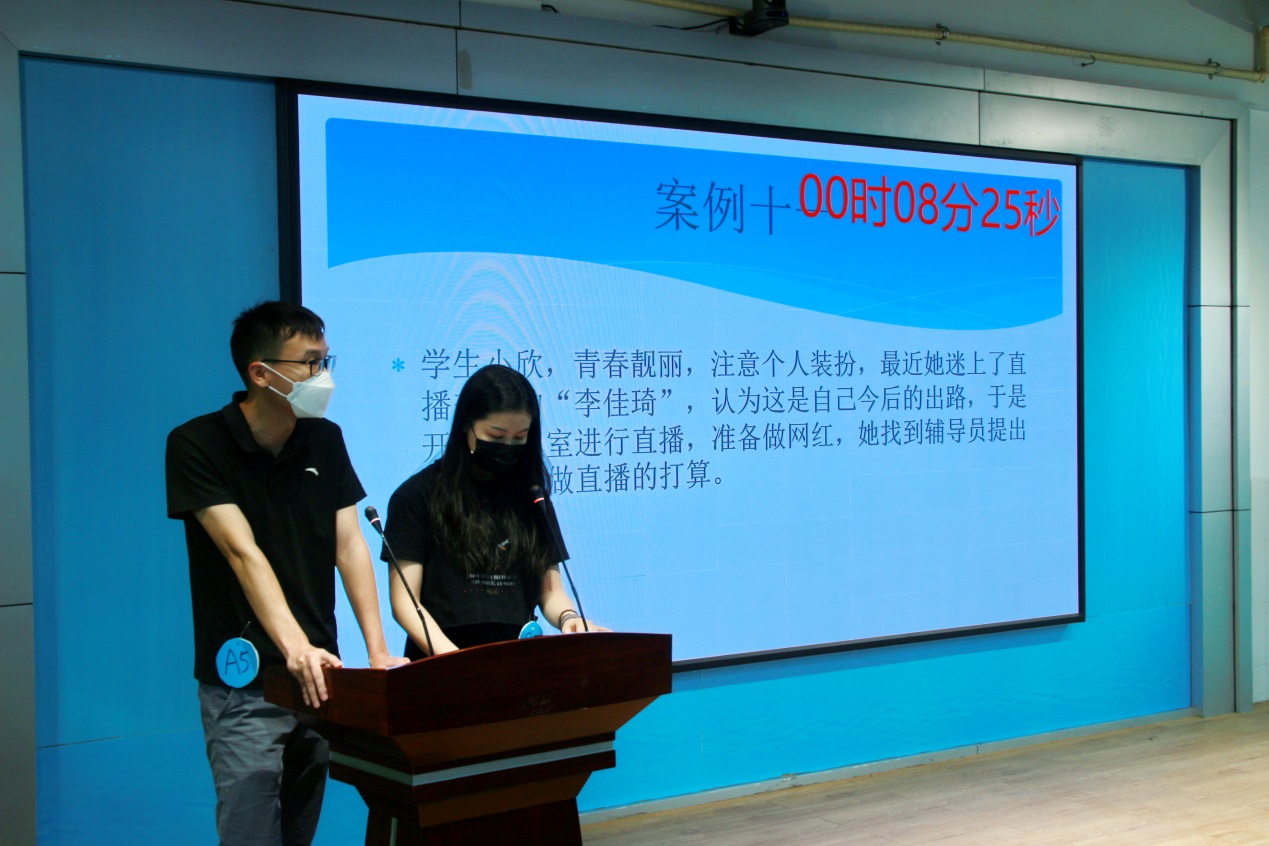 比賽分為案例研討和談心談話兩個(gè)項(xiàng)目,再現(xiàn)了當(dāng)下大學(xué)生思想政治教育和日常教育管理中的熱點(diǎn)難點(diǎn)問題,如疫情防控、價(jià)值取向、學(xué)業(yè)、就業(yè)、情感、人際關(guān)系、心理健康、學(xué)生干部培養(yǎng)等問題。案例研討以兩兩抽簽成組,“我提問,你回答”的方式開展。選手圍繞案例共同辨析原因、研討對(duì)策、總結(jié)規(guī)律。談心談話以情景再現(xiàn)的方式,參賽輔導(dǎo)員充分運(yùn)用思想政治教育及相關(guān)學(xué)科原理、方法、策略,為“學(xué)生”答疑解惑、指明方向。參賽選手思路清晰、導(dǎo)向正確,充分展示了我校輔導(dǎo)員積極向上的精神面貌和較高的職業(yè)素養(yǎng)。
