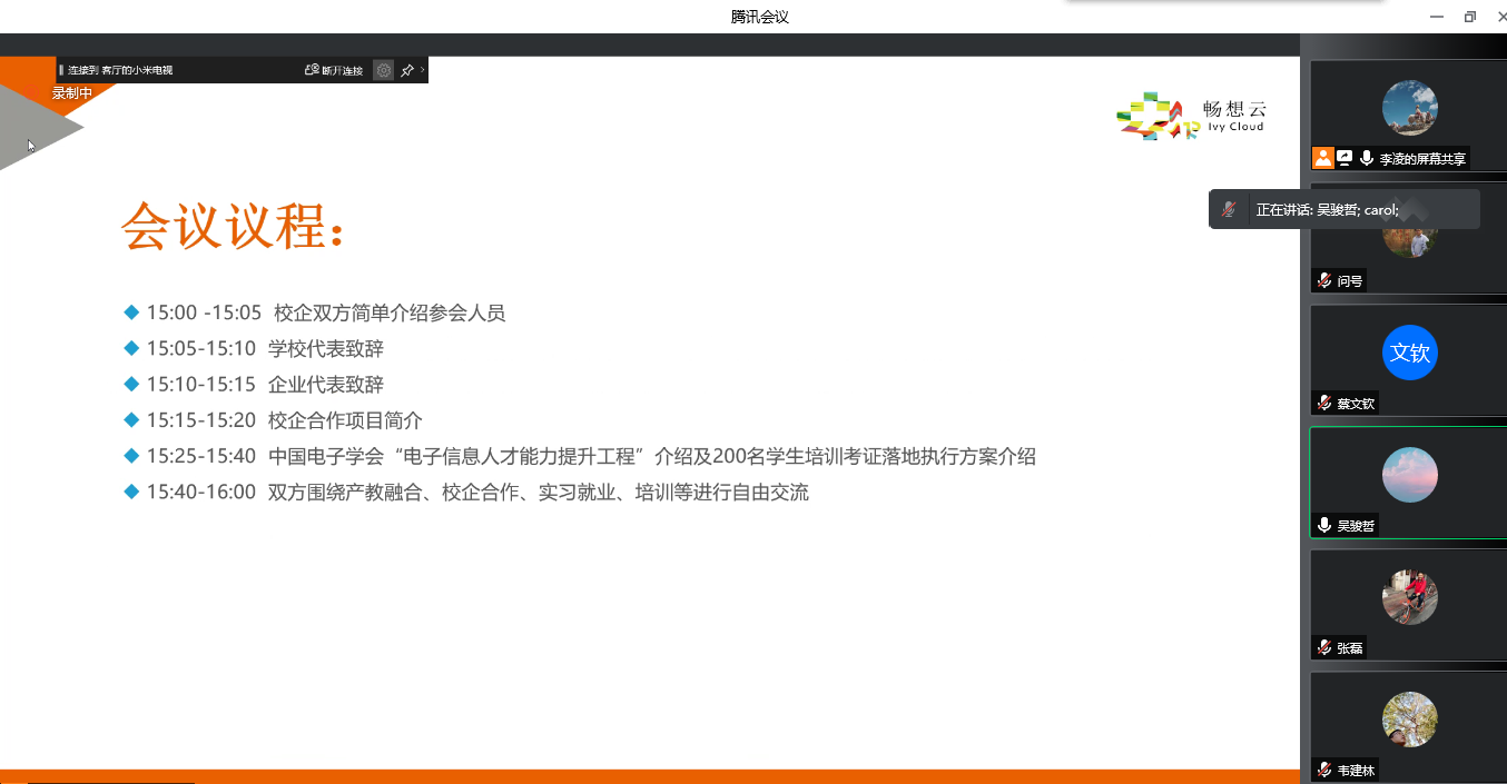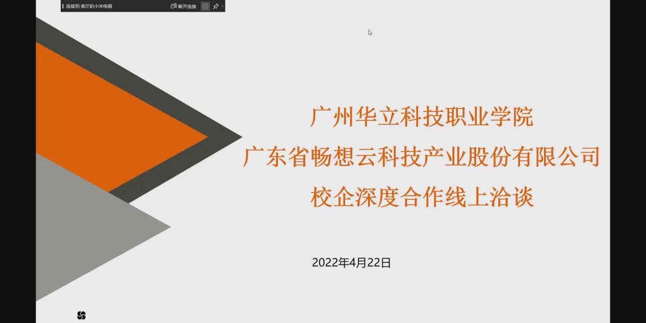 2022年4月22日下午,廣州華立科技職業(yè)學(xué)院與廣東省暢想云科技產(chǎn)業(yè)控股有限公司開展線上視頻交流會(huì)。暢想云公司董事長(zhǎng)趙暢、常務(wù)副總裁吳駿哲、副總裁李凌、等級(jí)考試主任江俊杰、培訓(xùn)主任李廣,我校校長(zhǎng)易健民博士教授、副校長(zhǎng)高堯來、計(jì)算機(jī)學(xué)院院長(zhǎng)王建華二級(jí)教授、實(shí)訓(xùn)中心主任張磊、校外教學(xué)與就業(yè)處處長(zhǎng)鐘文浩、副科長(zhǎng)韋建林、計(jì)算機(jī)學(xué)院辦公室主任蔡文欽等參加了線上會(huì)議。