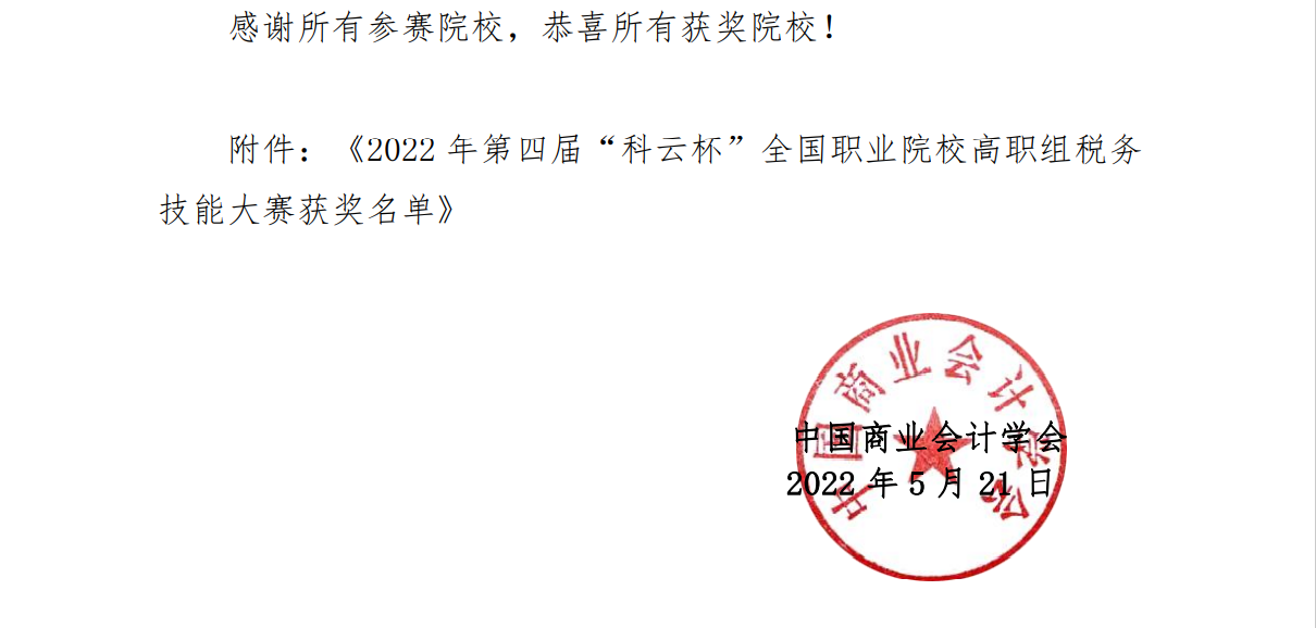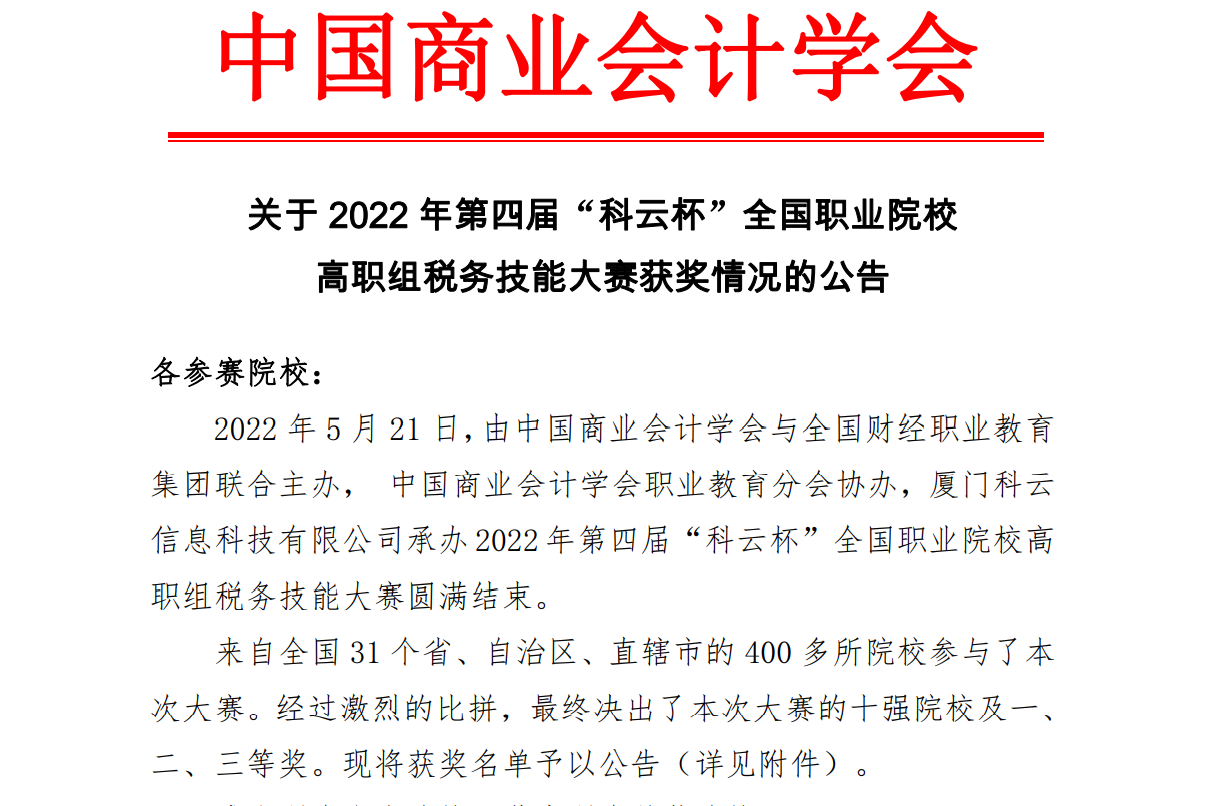 我校財(cái)會(huì)學(xué)子榮獲2022年第四屆“科云杯” 全國(guó)職業(yè)院校高職組稅務(wù)技能大賽一等獎(jiǎng)