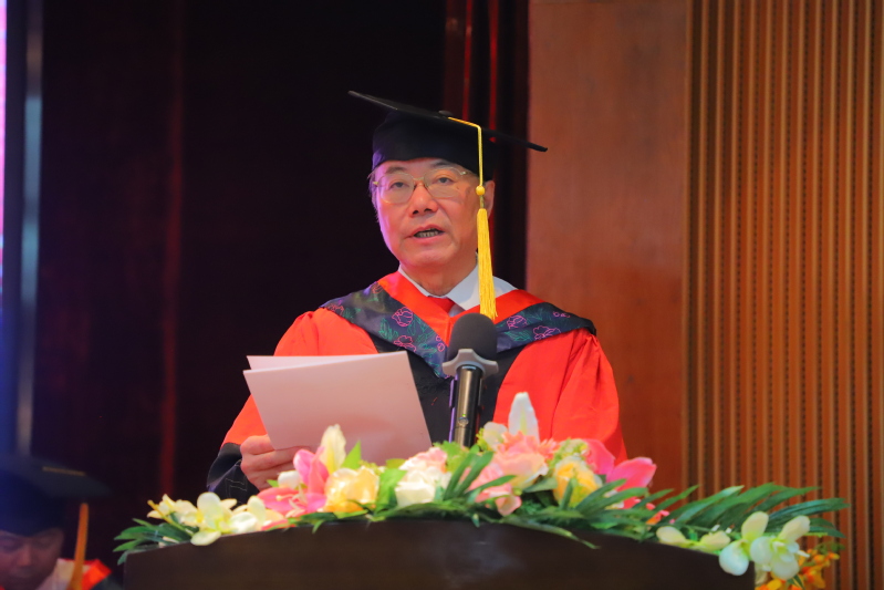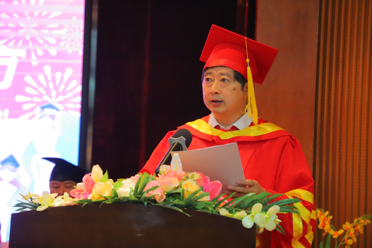 校長易健民教授致辭寄語畢業(yè)生。他殷切希望同學(xué)們充分利用學(xué)習(xí)資源,把學(xué)習(xí)融入到日常生活和工作中,堅持終身學(xué)習(xí)。堅持學(xué)習(xí)才能提高技能,堅持學(xué)習(xí)才能與時俱進,才能適應(yīng)數(shù)字化經(jīng)濟轉(zhuǎn)型。他囑托同學(xué)們不僅要繼續(xù)學(xué)習(xí),更要在實踐中提高能力,在實踐中求得真知,在實踐中提升技能。他認為一項事業(yè),不論大小,都是靠腳踏實地、一點一滴干出來的。未來比拼的,除了知識、技能外將是誰能更好地創(chuàng)新。希望同學(xué)們未來要勇于創(chuàng)新,敢于、樂于不斷實現(xiàn)自我突破,努力成為數(shù)字化轉(zhuǎn)型的能手,為國家建設(shè)和社會發(fā)展做出應(yīng)用貢獻。