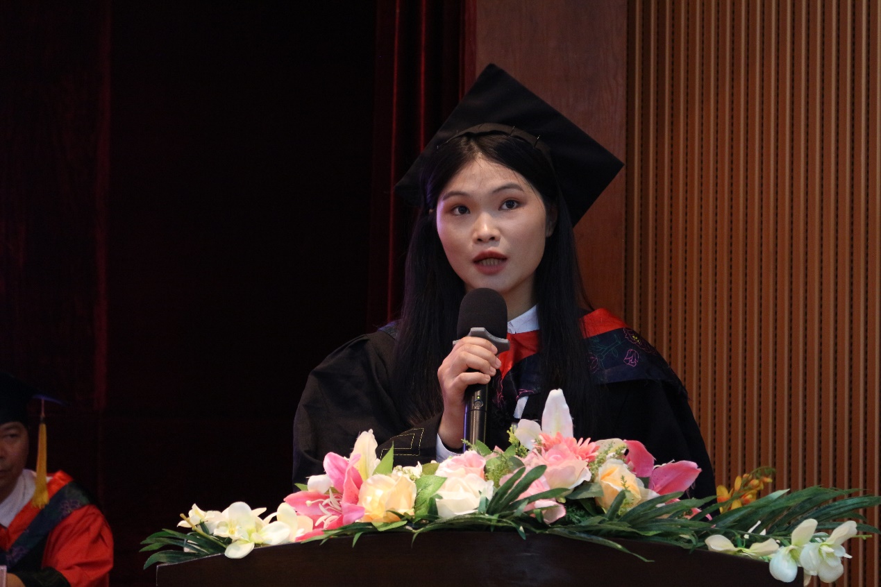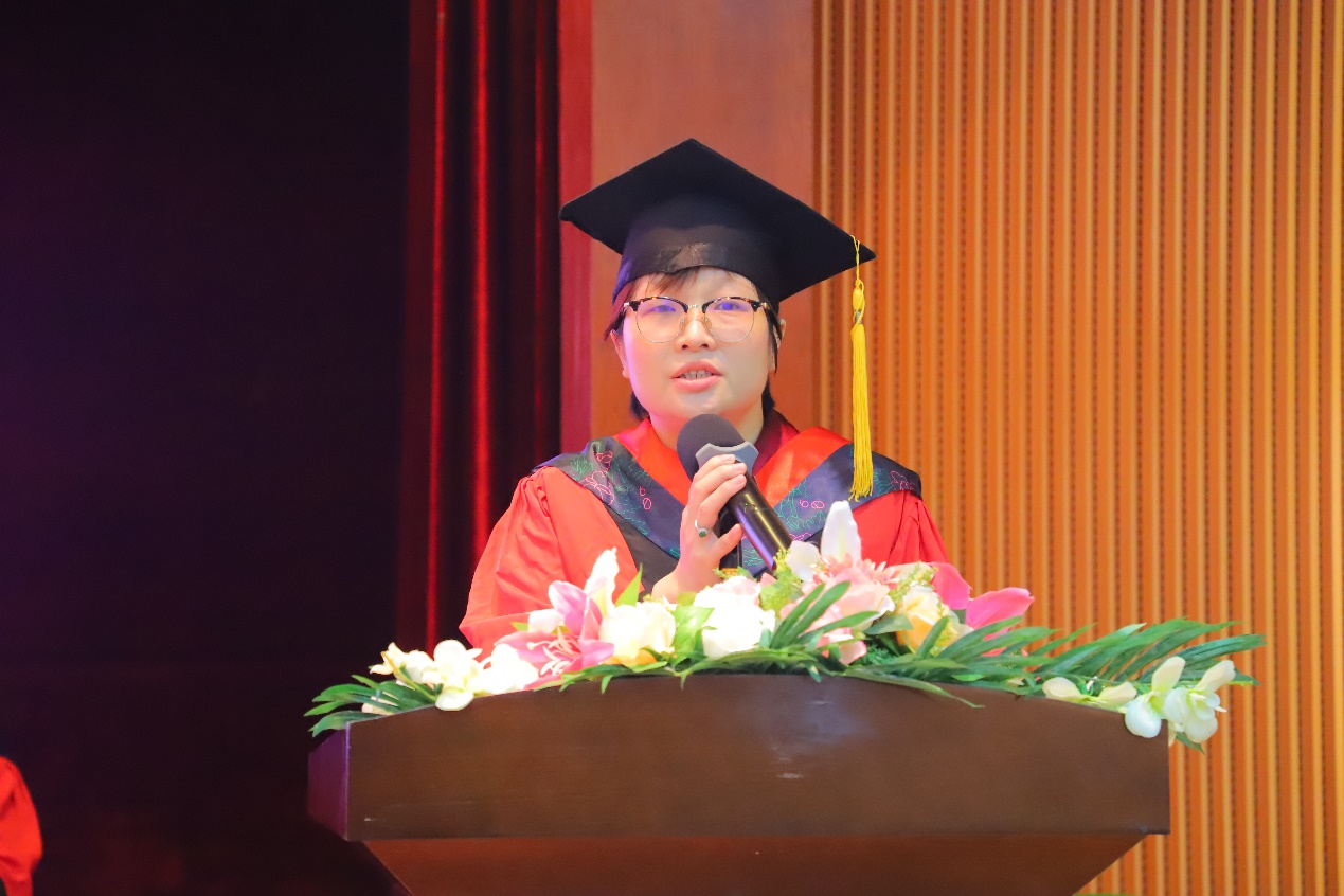 藝術(shù)與傳媒學(xué)院梁寶怡同學(xué)代表2022屆全體畢業(yè)生進行發(fā)言。她說到,感謝學(xué)校的悉心栽培,為同學(xué)們的發(fā)展提供的諸多平臺和展示的機會,讓自己在大學(xué)三年里得到了全方面的成長。表示自己會一直銘記“厚德 強能 務(wù)實 創(chuàng)新”的校訓(xùn),并身體力行。青春激昂的發(fā)言贏得了現(xiàn)場雷鳴般的掌聲。