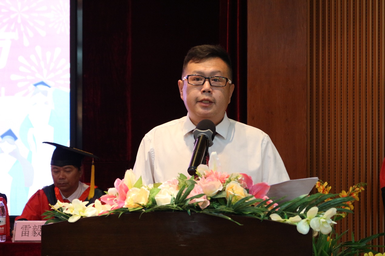 健康學(xué)院張邦奎副教授作為教師代表發(fā)言。他希望同學(xué)們做人要講誠信,有毅力,不要怕困難,要樂觀的看問題、處理事情。建立良好的信心,為家庭和社會,恪守自己的本分;他認為成人比成才更為重要。希望大家一定要經(jīng)得起考驗,要相信陽光總在風(fēng)雨后。未來技術(shù)會更成熟,價值觀以及物質(zhì)條件會逐步完善,具有社會交往能力的會更加精進。希望大家謹(jǐn)記回報國家和為社會做出貢獻,認真體會“大國工匠,技術(shù)強國”的深刻含義。