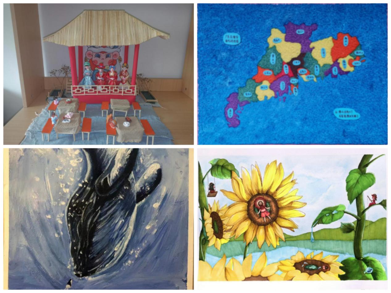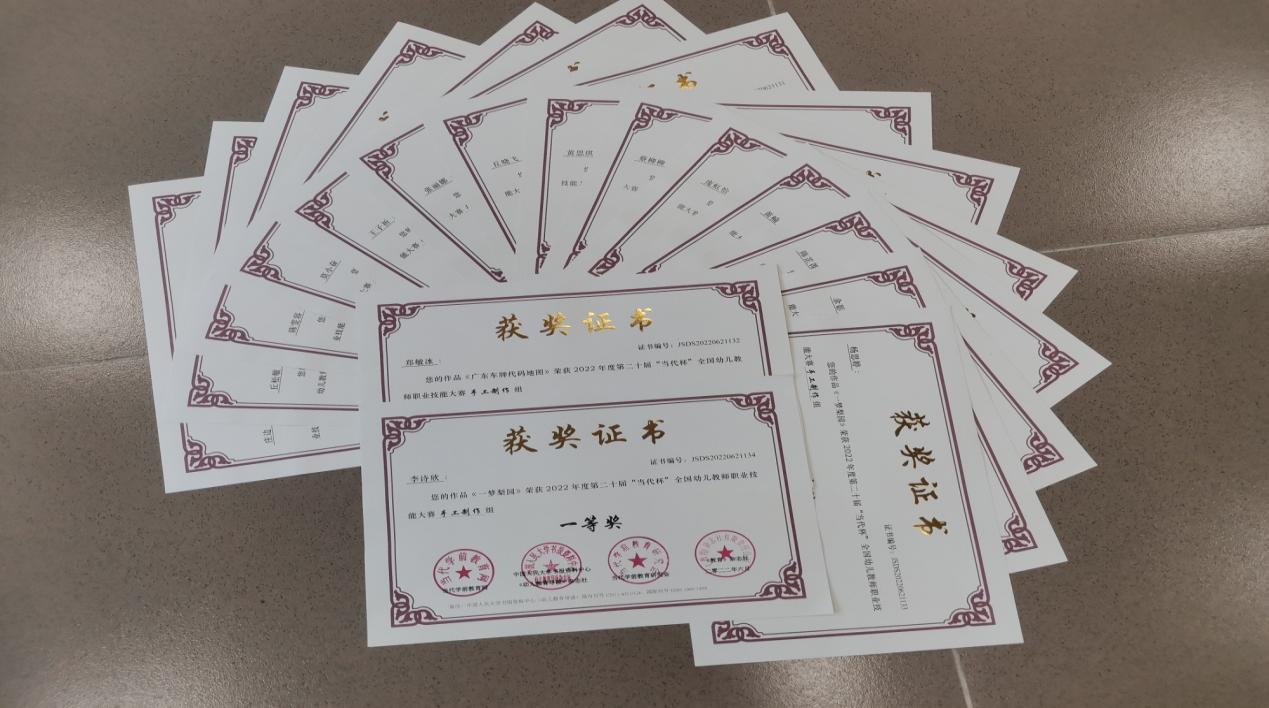 其中,楊思婷、李詩欣和余影同學(xué)的作品《一夢梨園》、鄭敏冰同學(xué)的作品《廣東車牌代碼地圖》榮獲大賽手工制作類一等獎;丘曉飛同學(xué)的作品《森系小屋》、張麗娜同學(xué)的作品《動物園》榮獲大賽手工制作類二等獎;莊邊同學(xué)的作品《北京冬奧2022》、呂小晴同學(xué)的作品《藍(lán)鯨》、陳雯容同學(xué)的作品《疫情后的春天》獲大賽繪畫類二等獎;丘松敏同學(xué)的代表作《大班科學(xué)活動我愛吹泡泡》獲大賽說課稿類二等獎;莫小奮的代表作《粉刷匠》獲大賽兒歌彈唱類二等獎。此外,黃思琪、羅淑娜等7位同學(xué)的作品獲各類賽項三等獎;鄧妙婷等3位同學(xué)的作品獲大賽優(yōu)秀獎。