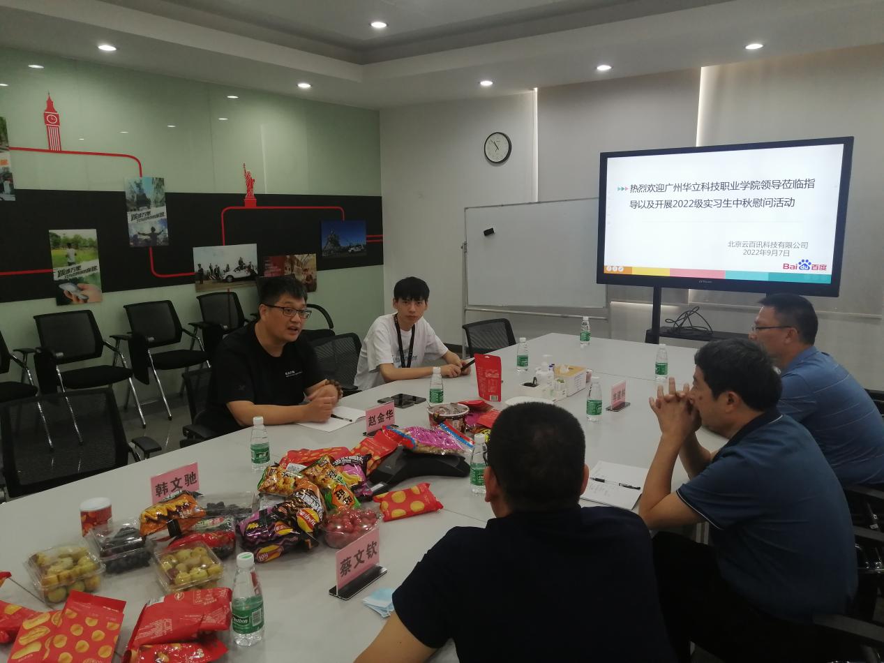 9月7日,中秋佳節(jié)之際,廣州華立科技職業(yè)學(xué)院校長易健民、校外教學(xué)與就業(yè)管理處副科長韋建林、計(jì)算機(jī)信息工程學(xué)院辦公室主任蔡文欽、校外教學(xué)副主任黃志強(qiáng)老師一行到北京云百訊科技有限公司佛山分公司看望2020級(jí)實(shí)習(xí)學(xué)生,開展中秋節(jié)慰問活動(dòng)。