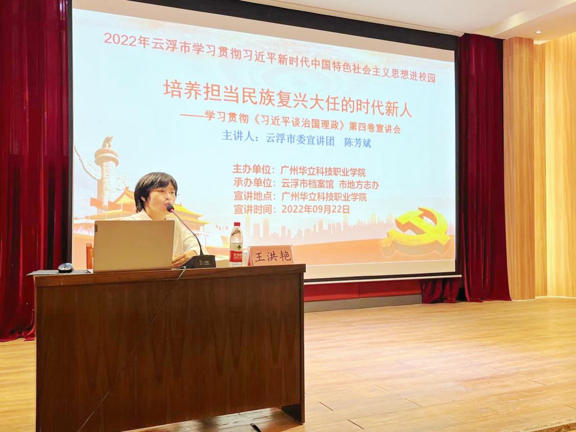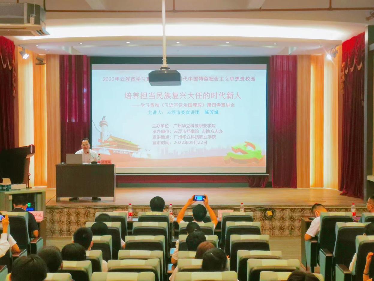 教育興則國家興,教育強則國家強。培養(yǎng)什么樣的人、如何培養(yǎng)人以及為誰培養(yǎng)人,一直是習近平總書記強調的重中之重。為了推動廣大師生進一步增強學思想、悟思想、用思想的自覺性與堅定性;不斷提高政治判斷力、政治領悟力、政治執(zhí)行力。9月22日,廣州華立科技職業(yè)學院云浮校區(qū)特邀云浮市檔案館館長、云浮市人民政府地方志辦公室主任、云浮市委宣講團成員陳芳斌來校開展學習貫徹《習近平談治國理政》第四卷專題報告會。