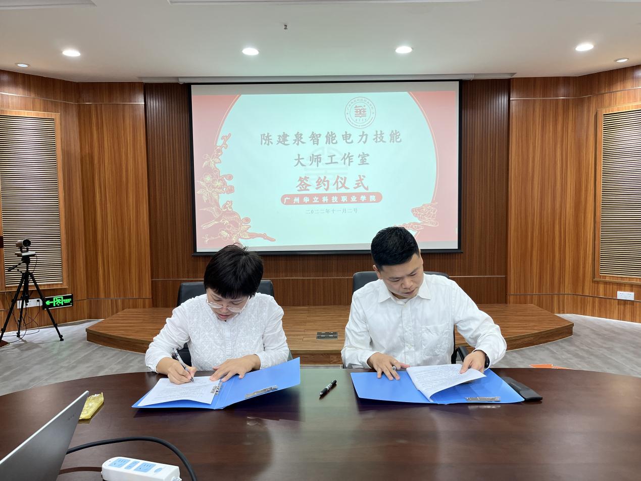 (王洪艷副校長與陳建泉進行智能電力技能大師工作室簽約儀式)