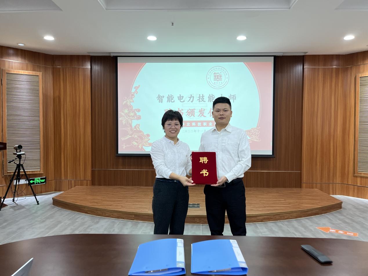 (王洪艷副校長給陳建泉頒發(fā)智能電力技能大師聘書)