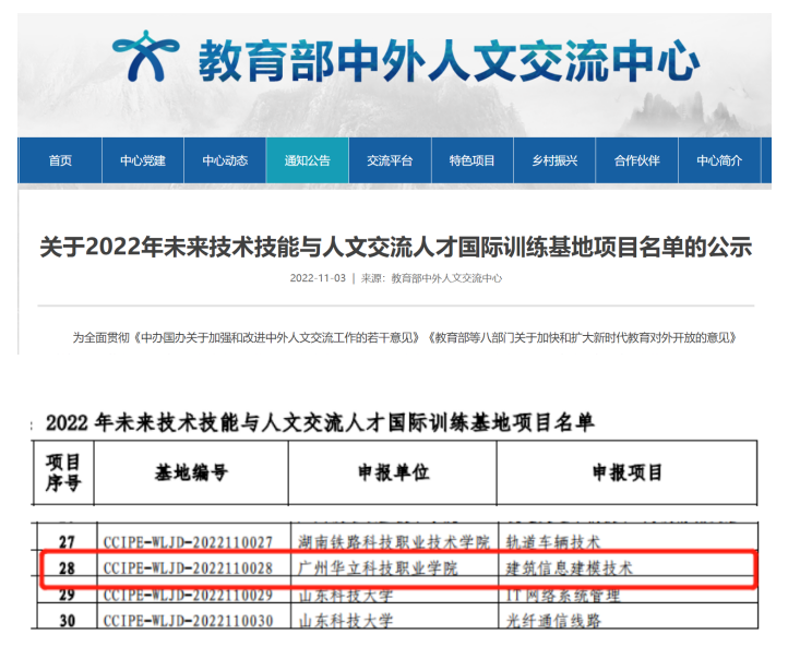 2022年11月3日,教育部中外人文交流中心發(fā)布《關于2022年未來技術技能與人文交流人才國際訓練基地項目名單的公示》,廣州華立科技職業(yè)學院城建學院申報的《建筑信息建模技術》基地項目成功入選教育部中外人文交流中心“未來技術技能與人文交流人才國際訓練基地”項目!