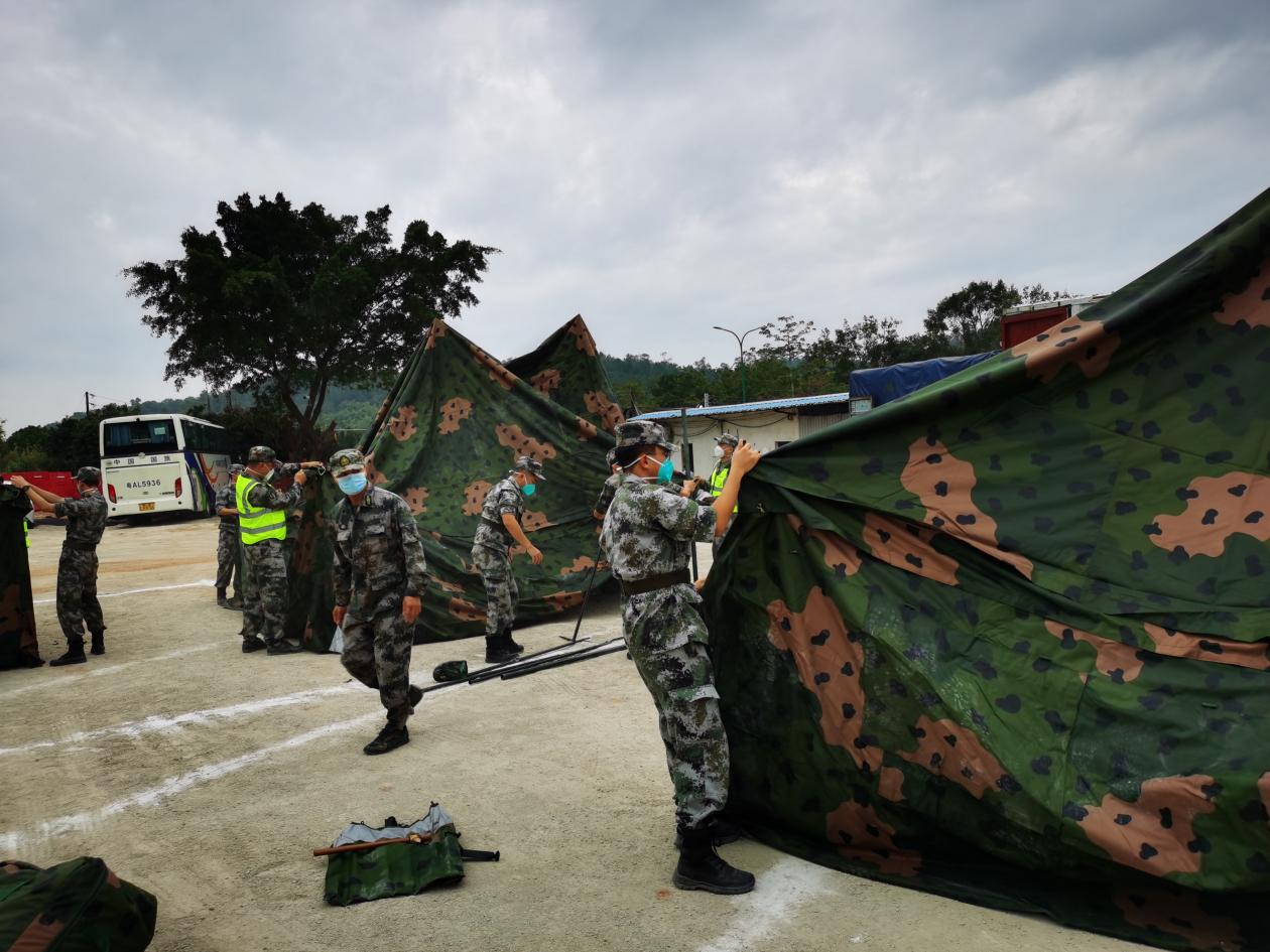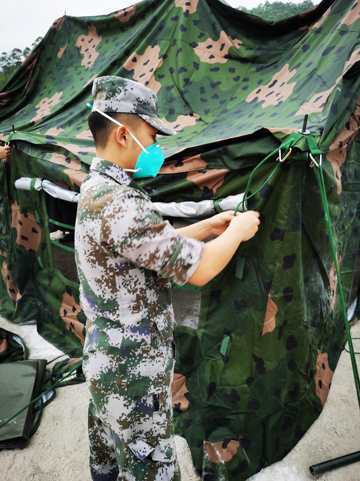 在全體人員的共同努力、團結(jié)協(xié)作下,經(jīng)過6個多小時的奮戰(zhàn),高標準完成此次保障支援任務(wù),共完成了21頂軍用帳篷、68頂民用帳篷的搭設(shè),保障了320個床位和床上用品等生活物資,順利交付政府投入使用,為增城區(qū)疫情防控工作提供了強有力的保障。支援行動結(jié)束后,我校收到中國人民解放軍廣州市增城區(qū)人民武裝部發(fā)來的感謝信,特別感謝我院對此次工作的大力支持,并高度贊賞領(lǐng)隊陳勝軍同志的嚴密組織工作,同時表揚我院退役學(xué)生的積極配合并出色完成工作任務(wù),特別是洪濟沛、李祥鴻、黃安瀟等同學(xué)的奉獻精神。
