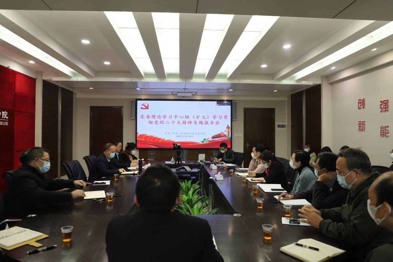 2022年12月8日下午,廣州華立科技職業(yè)學院黨委理論中心組(擴大)在行政樓305會議室舉行第二次學習貫徹黨的二十大精神專題報告會。學校黨委書記陳良聲,校長易健民,副書記、副校長高堯來,副校長陳顯強以及各黨總支、直屬黨支部負責人,全體思政教師、教師黨員代表參加了會議。會議由黨委辦公室主任孟允煌主持。我校云浮校區(qū)領導干部也通過視頻連線參加了本次專題學習。
