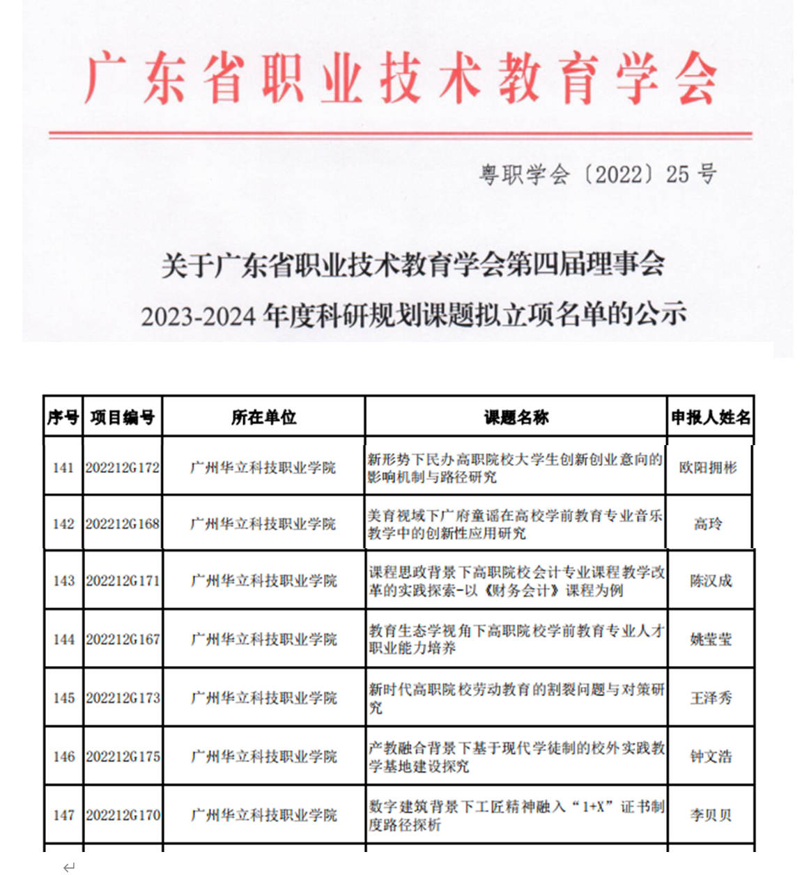 近日,關(guān)于廣東省職業(yè)技術(shù)教育學(xué)會(huì)2023-2024 年度科研規(guī)劃課題擬立項(xiàng)名單的公示。我校歐陽(yáng)擁彬等7位老師獲得立項(xiàng)。具體立項(xiàng)情況見(jiàn)下表截圖。