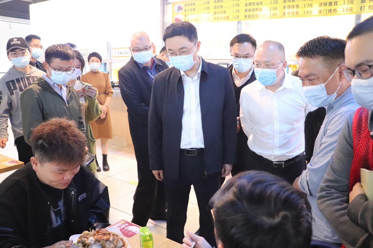 吳澤桐常務一行深入學生食堂,實地察看了“智慧餐廳”自助供餐點、餐廳各服務窗口,詳細詢問了食堂日常運營情況、食品安全監(jiān)管責任落實情況,仔細了解了食堂“明廚亮灶”、特色餐飲窗口、食材采購、學生就餐、飯菜價格和應急措施等,對學校食品安全管理工作給予肯定,特別對膳食委員會學生干部主動參與食堂管理給予高度表揚。