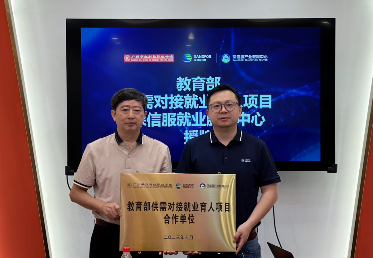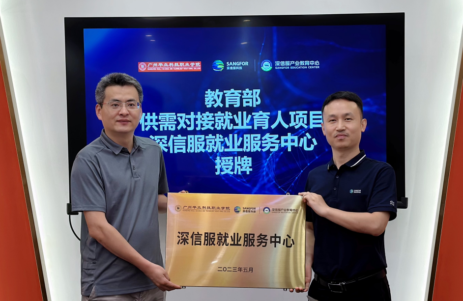 隨后,校企雙方舉行合作揭牌儀式。廣州華立科技職業(yè)學(xué)院校長易健民、深信服產(chǎn)教融合部負(fù)責(zé)人呂沐陽共同為“教育部供需對(duì)接就業(yè)育人項(xiàng)目合作單位”,校長助理張劍鋒、深信服廣州分公司副總經(jīng)理黃福印共同為“深信服就業(yè)服務(wù)中心”揭牌。