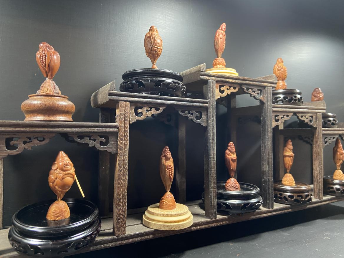 周大師重點(diǎn)介紹了增城博物館收藏的湛谷生欖雕作品《蘇東坡夜游赤壁舫》。湛谷生(又稱菊生),清咸豐四年(1854),新塘欖核雕刻藝術(shù)家。作品所有刀鑿皆親自煉精鐵煅打而成,創(chuàng)作工藝十分精巧,所雕的人物情態(tài)各異,栩栩如生,被譽(yù)為增城欖雕代表作。湛谷生還擅長(zhǎng)刻其他精品,曾刻十八羅漢核雕,山石樹木,疏落有致,其技巧可謂鬼斧神工。
