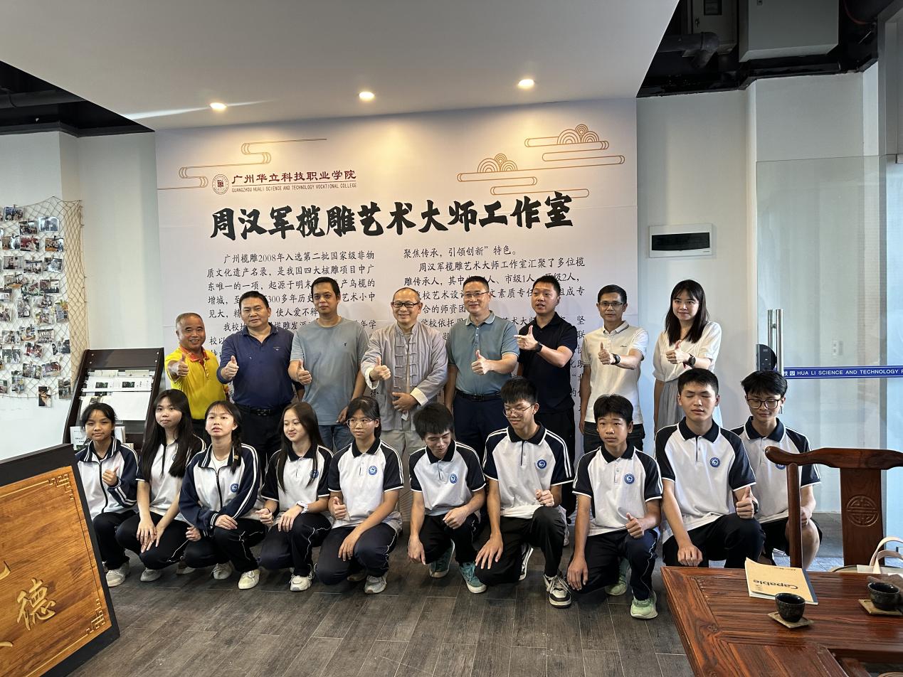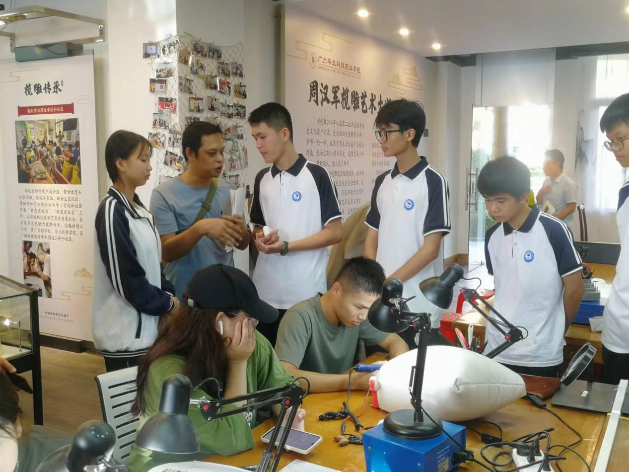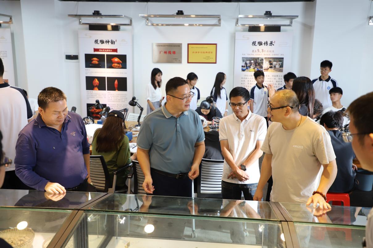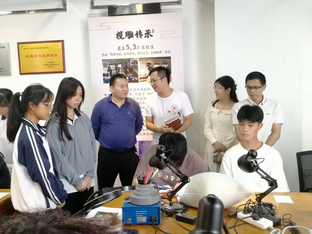 座談會(huì)后,黃勁勇副局長(zhǎng)一行和增城區(qū)廣播電視大學(xué)師生一起到我校廣州欖雕中華優(yōu)秀傳統(tǒng)文化基地進(jìn)行實(shí)地考察,與基地教師和學(xué)生進(jìn)行了交流,深入了解基地欖雕教學(xué)開(kāi)展情況,并對(duì)非遺進(jìn)校園建設(shè)的細(xì)節(jié)提出了建設(shè)性意見(jiàn)。