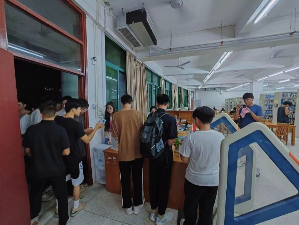 “三十本書閱讀工程”啟動儀式結(jié)束后,同學(xué)們紛紛走進(jìn)圖書館借書。