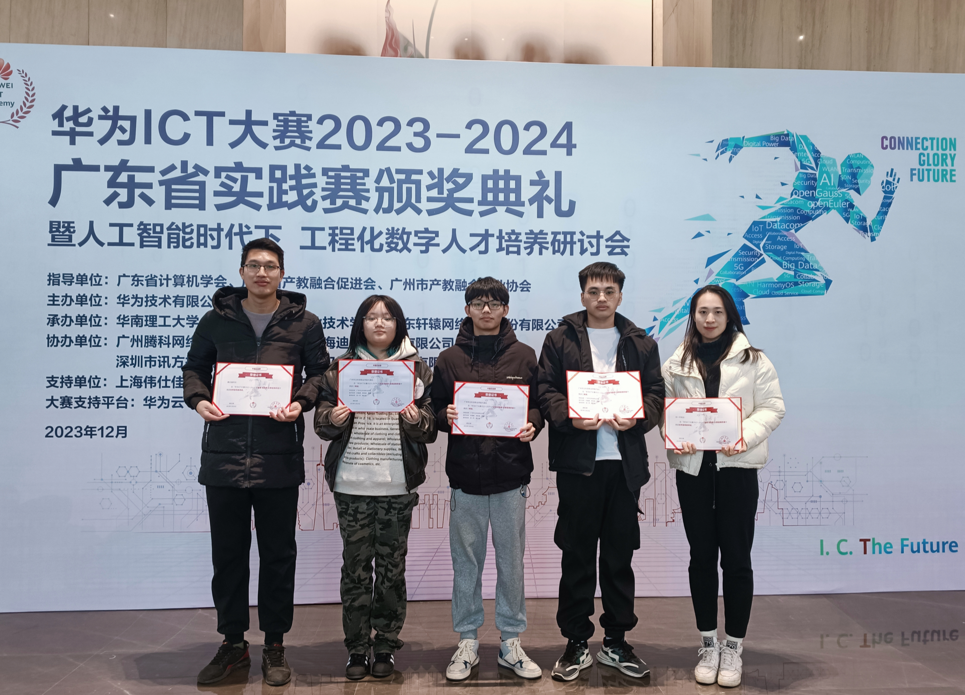 在2023年10月至12月舉行的華為ICT大賽中,由我校計(jì)算機(jī)學(xué)院學(xué)生歐陽政、史嘉豪(云浮校區(qū))、黎靜(廣州校區(qū))和指導(dǎo)老師鄧一平、黃志強(qiáng)組成的參賽小組獲得廣東省實(shí)踐賽決賽云賽道高職組二等獎一項(xiàng),另有2個參賽小組分別獲得計(jì)算賽道和網(wǎng)絡(luò)賽道的三等獎2項(xiàng)。部分獲獎學(xué)生和指導(dǎo)老師出席了12月24日在廣州舉行的頒獎典禮。