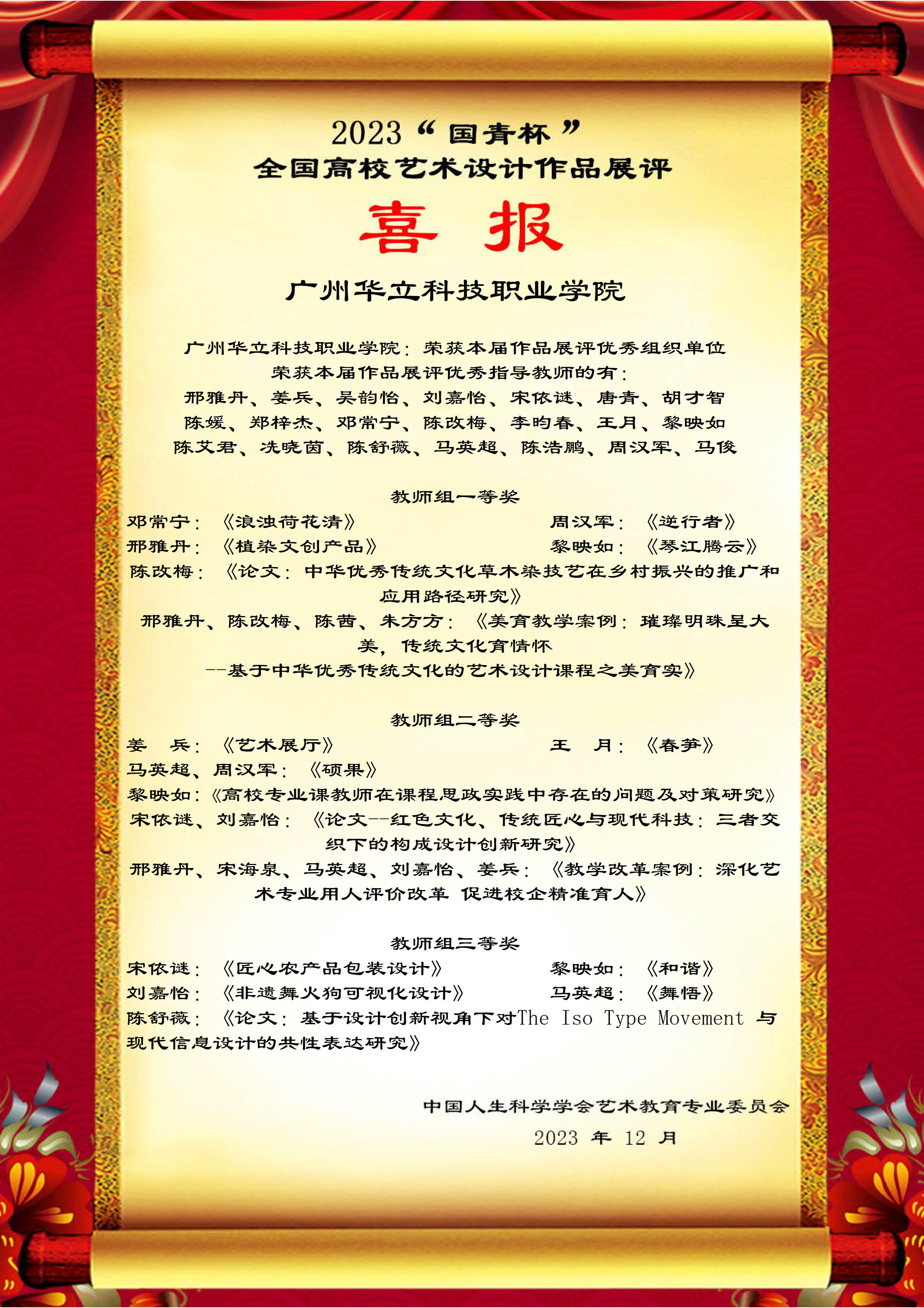 基于此,中國人生科學學會藝術教育專業(yè)委員會授予廣州華立科技職業(yè)學院為本屆作品展評優(yōu)秀組織單位;授予馬俊、周漢軍、陳改梅、邢雅丹、黎映如、劉嘉怡、姜兵、吳韻怡、宋依謎、唐青、胡才智、陳媛、鄭梓杰、鄧常寧、李昀春、王月、陳艾君、冼曉茵、陳舒薇、馬英超、陳浩鵬為本屆作品展評優(yōu)秀指導教師。
