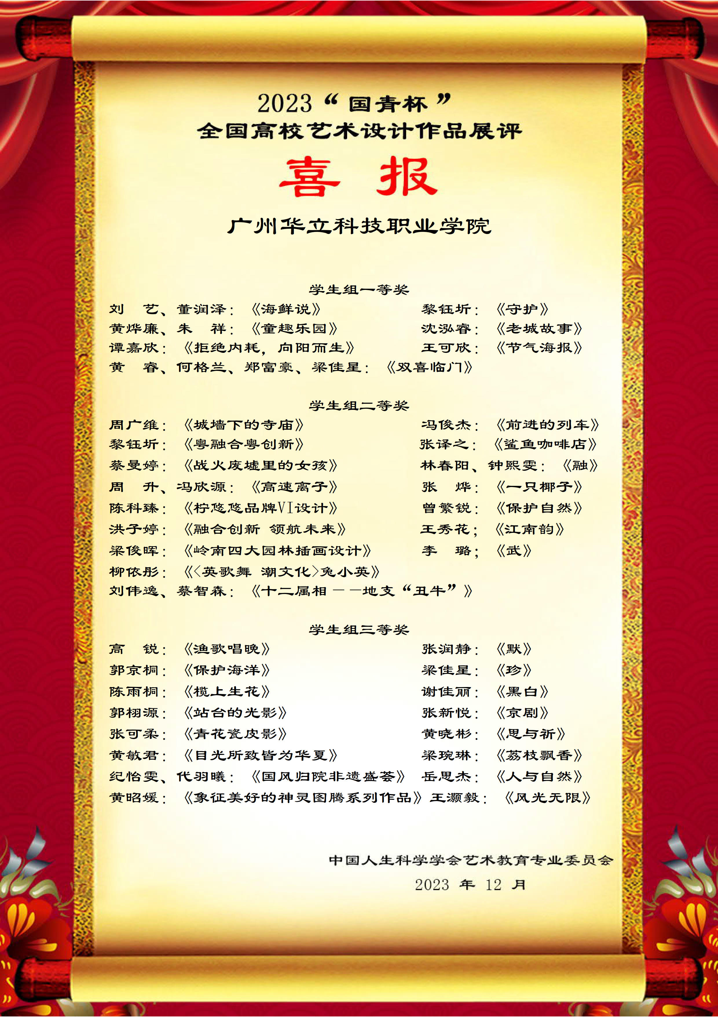 中國人生科學學會藝術教育專業(yè)委員會組織的2023“國青杯”全國高校藝術設計作品展評,旨在探索藝術設計教育發(fā)展新趨勢,創(chuàng)新藝術設計人才培養(yǎng)機制,為廣大高校師生搭建相互交流、提高的平臺, 是我國高校藝術類大賽中規(guī)模最大、參與院校最多的高端專業(yè)賽事。