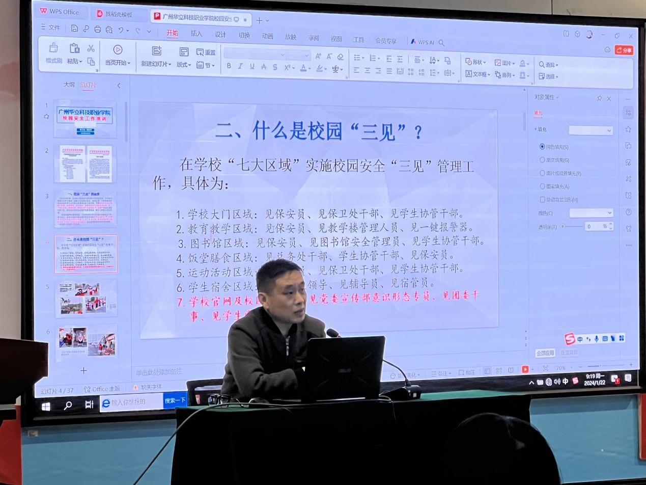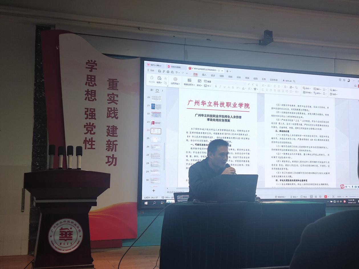 隨后,由保衛(wèi)處處長陳勝軍作為主講老師,開展校園“三見”工作培訓(xùn),講授了“三見”工作的實施范圍、具體職責(zé)和安排以及實行三級管控等相關(guān)內(nèi)容。同時,陳勝軍處長結(jié)合近期在校園發(fā)生的幾起案例進行分析,讓參與者更加深入了解“三見”工作對于校園安全的重要性,并掌握相應(yīng)的安全知識和技能。最后,由學(xué)生處處長張志君老師對我校幾類重要的應(yīng)急預(yù)案進行講授,包括師生人身傷害事故、自然災(zāi)害事件、消防安全、重大斗毆 、 自殺 、 傷殘事件等應(yīng)急預(yù)案,讓大家了解掌握各類應(yīng)急處突的程序、技能等,能夠在校園事故發(fā)生時正確處理,避免后續(xù)不必要的麻煩與責(zé)任。