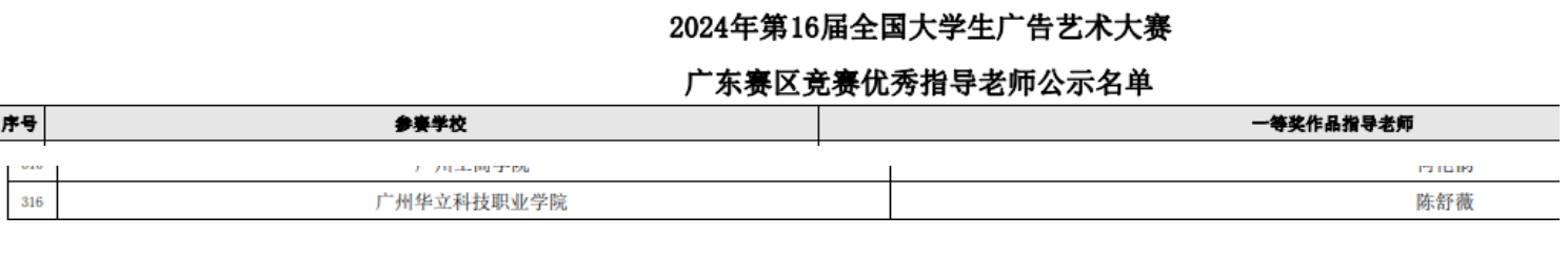 近日,由廣東省教育廳主辦,深圳大學(xué)承辦的2024年第16屆全國大學(xué)生廣告藝術(shù)大賽廣東賽區(qū)競賽獲獎(jiǎng)結(jié)果已公示。廣州華立科技職業(yè)學(xué)院藝術(shù)與傳媒學(xué)院選送的作品共獲得一等獎(jiǎng)1項(xiàng)、二等獎(jiǎng)1項(xiàng)、三等獎(jiǎng)1項(xiàng)。同時(shí),陳舒薇老師獲得“優(yōu)秀指導(dǎo)老師獎(jiǎng)”。本次所有獲獎(jiǎng)作品將報(bào)送北京,代表廣東賽區(qū)參加全國總決賽。