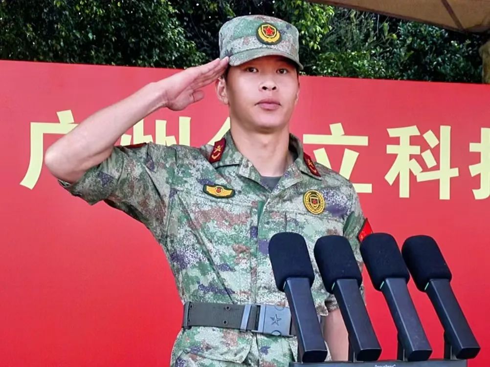 軍訓(xùn)團(tuán)領(lǐng)導(dǎo)、廣州市增城區(qū)人民武裝部指導(dǎo)員駱健康代表教官上臺發(fā)言。他強(qiáng)調(diào)了學(xué)生軍訓(xùn)工作是加強(qiáng)全民國防教育、國防后備力量建設(shè)和青年學(xué)生素質(zhì)教育的重要措施。軍訓(xùn)對于在站各位同學(xué)而言不僅是一門軍事理論課程,更是一段體驗(yàn)軍旅生活的寶貴經(jīng)歷。駱教官對全體教官做出了嚴(yán)格要求:一是在訓(xùn)練過程中各位教官要嚴(yán)格遵守民兵教官“十個(gè)嚴(yán)禁”;二是要科學(xué)安排軍訓(xùn)強(qiáng)度,合理安排調(diào)整訓(xùn)練課程。對同學(xué)們也提出兩點(diǎn)希望:一是自覺遵守軍訓(xùn)紀(jì)律;二是要通過軍訓(xùn)要養(yǎng)成吃苦耐勞的精神并將之運(yùn)用到今后的學(xué)習(xí)和生活中!駱教官的講話鏗鏘有力、鼓舞人心,贏得了在場師生的陣陣掌聲。