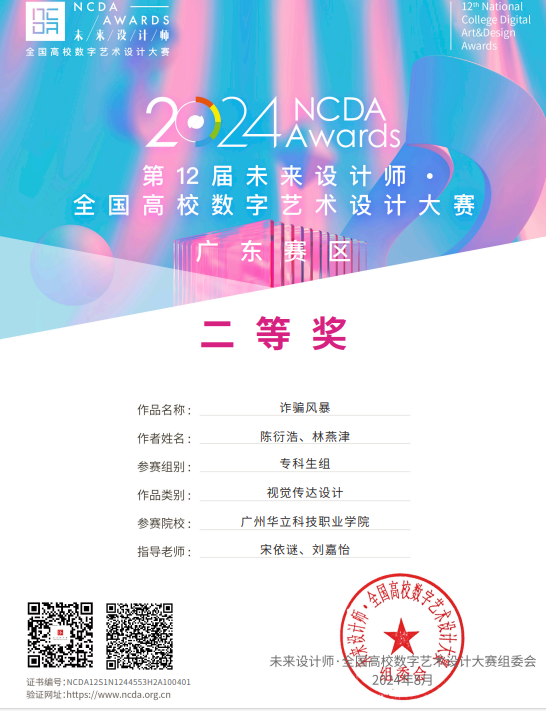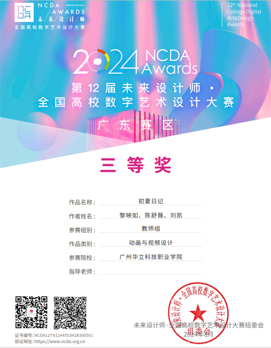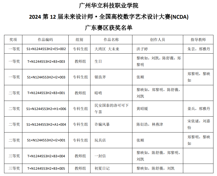 本次大賽自啟動以來,吸引了全國1891所高校的積極參與,共收到作品298763件,設立了29個省級賽區(qū)。經過激烈的校級賽、資格賽、省級初賽、省級決賽及全國總決賽的多輪選拔,我校藝術與傳媒學院師生取得了令人矚目的成績:在全國總決賽中,獲得學生組二等獎1項。在廣東省賽區(qū)獲獎13項,其中學生組一等獎2項,二等獎3項,教師組一等獎1項,二等獎1項,三等獎2項,優(yōu)秀指導教師4項。