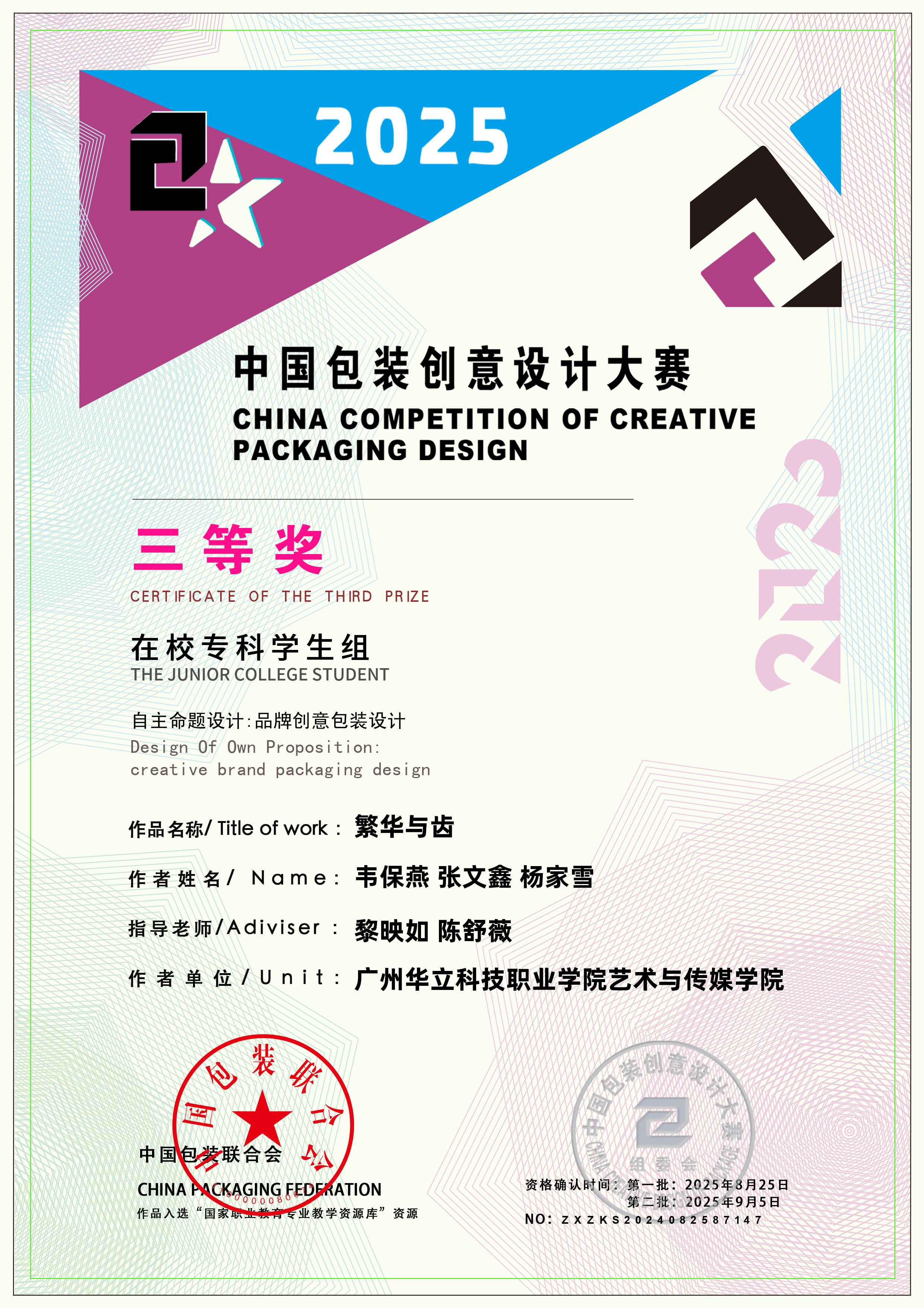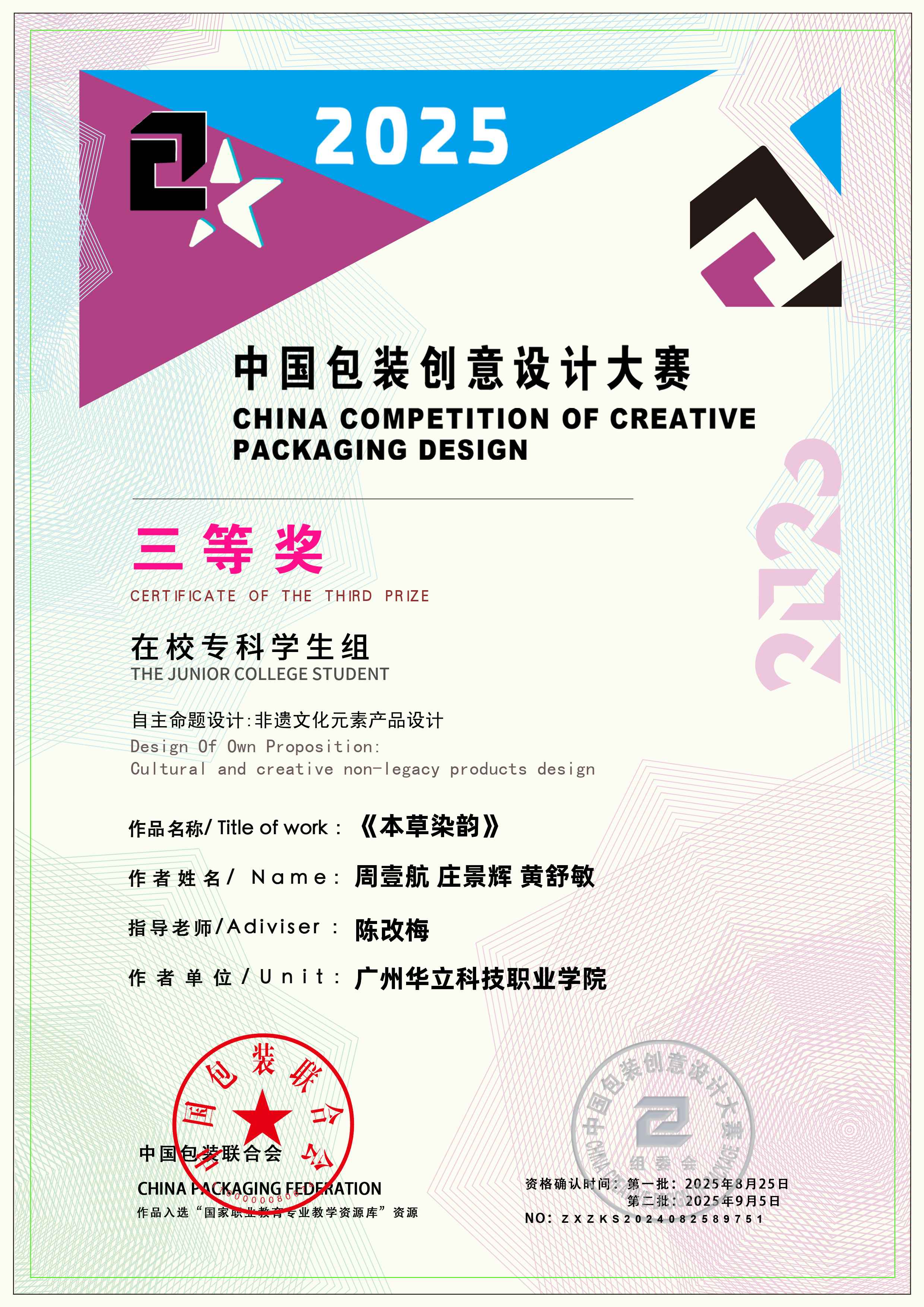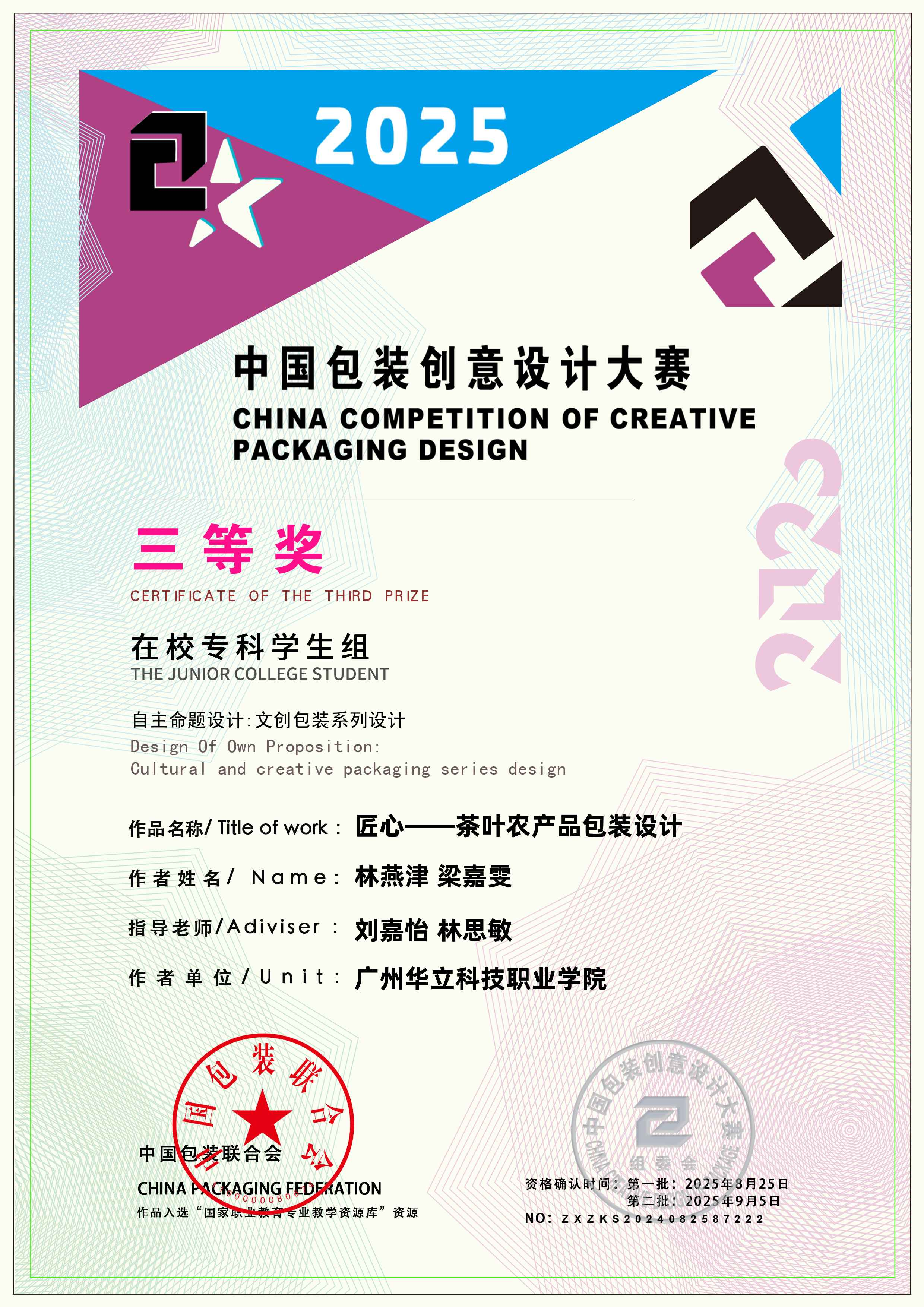 近日,2025中國包裝創(chuàng)意設(shè)計大賽獲獎名單正式公布,藝術(shù)與傳媒學(xué)院學(xué)生作品表現(xiàn)突出,作品《本草染韻》(作者:周壹航、 莊景輝、 黃舒敏,指導(dǎo)老師:陳改梅)榮獲全國三等獎;作品《山野珍饈 》(作者:吳其晃,指導(dǎo)老師:黎映如、 陳舒薇)榮獲全國三等獎;作品《繁華與齒》(作者:韋保燕、 張文鑫、 楊家雪,指導(dǎo)老師:黎映如、 陳舒薇)榮獲全國三等獎;作品《云燈鳶舞》(作者:簡集奮、林嘉倪,指導(dǎo)老師:劉嘉怡、林思敏、宋依謎)榮獲全國三等獎;作品《匠心——茶葉農(nóng)產(chǎn)品包裝設(shè)計》(作者:林燕津、梁嘉雯,指導(dǎo)老師:劉嘉怡、林思敏)榮獲全國三等獎。共斬獲國家級三等獎5項、優(yōu)秀獎6項,總計獲獎11項,充分展現(xiàn)了藝術(shù)與傳媒學(xué)院在設(shè)計教育與創(chuàng)新實踐方面的扎實成效。