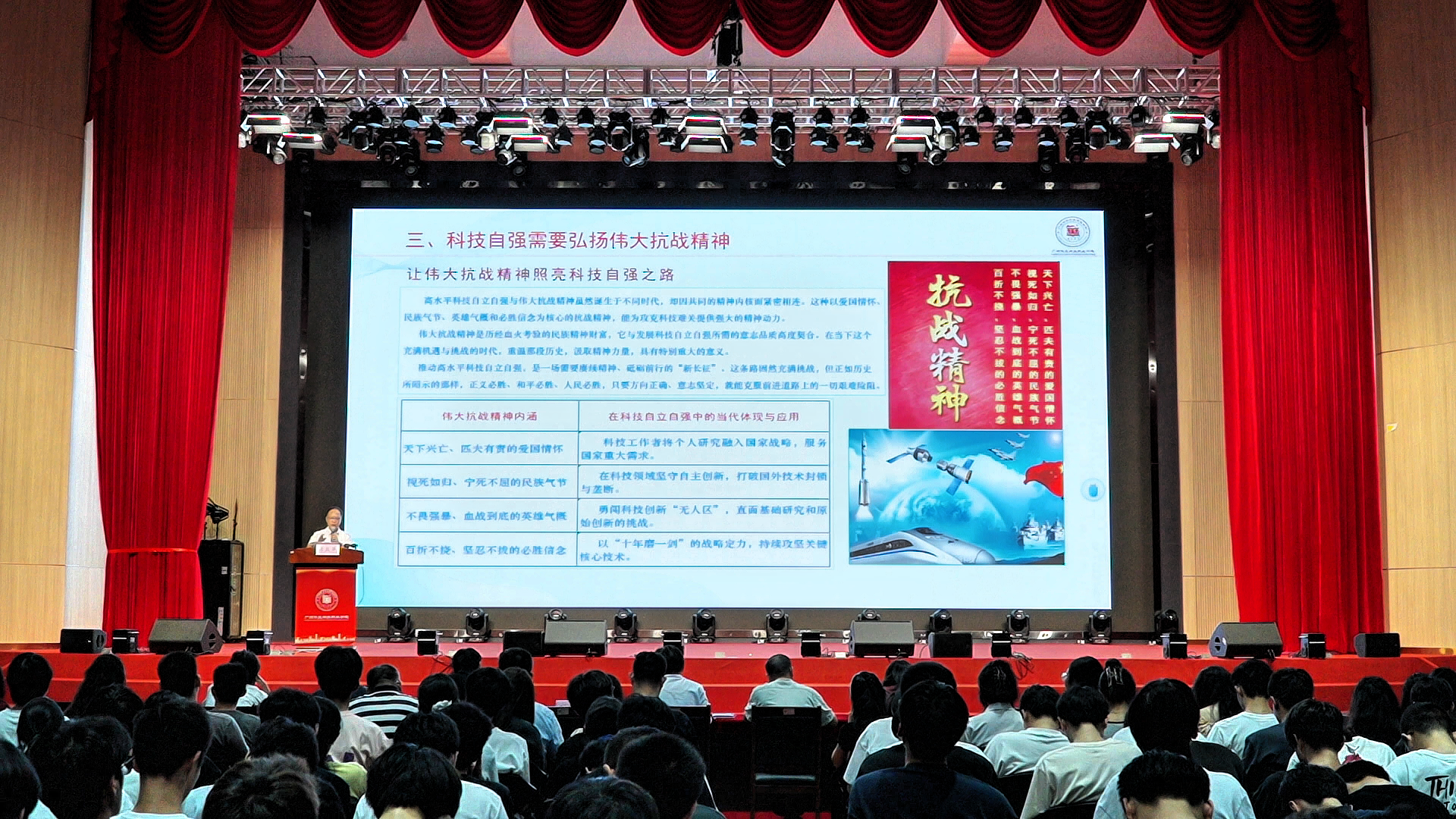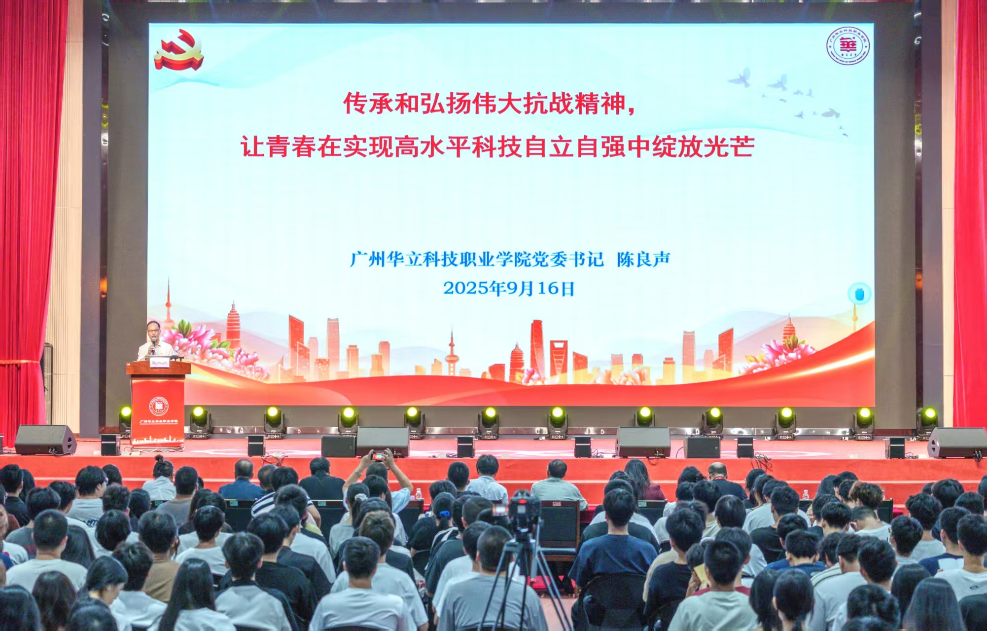 9月16日,廣州華立科技職業(yè)學(xué)院云浮校區(qū)文體樓8樓報告廳內(nèi)座無虛席,氣氛莊重而熱烈。學(xué)校黨委書記陳良聲同志以“傳承和弘揚偉大抗戰(zhàn)精神,讓青春在實現(xiàn)高水平科技自立自強中綻放光芒”為題,圍繞“關(guān)于科技創(chuàng)新的重要論述、我國科技創(chuàng)新的當(dāng)代成就、科技自強需弘揚抗戰(zhàn)精神、在科技自立中譜寫新華章”四個方面內(nèi)容,為2025級新生代表講授了一堂深刻而精彩的秋季學(xué)期“思政第一課”。這堂思政課不僅是一次思想的洗禮,更是一次奮進的動員,深刻闡述了偉大抗戰(zhàn)精神的時代價值,并將其與當(dāng)代青年學(xué)子的歷史使命、與國家實現(xiàn)高水平科技自立自強緊密相連。