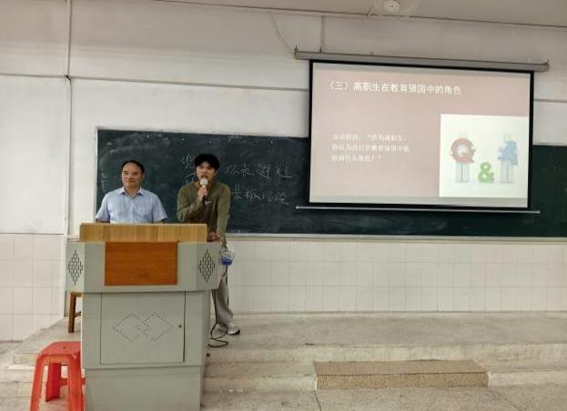廖校長強調(diào),職業(yè)教育是與普通教育同等重要的教育類型,是國民教育體系和人力資源開發(fā)的重要組成部分。高職畢業(yè)生占新增就業(yè)人口70%,制造業(yè)一線技術(shù)骨干80%來自高職,職業(yè)教育已成為教育強國的“半壁江山”,職業(yè)教育大有可為。在互動環(huán)節(jié),他提出“作為高職學(xué)生,你認(rèn)為自己在教育強國中能扮演什么角色”等問題,引發(fā)學(xué)生深思。他引用習(xí)近平總書記的青年寄語:“青年一代有理想、有本領(lǐng)、有擔(dān)當(dāng),國家就有前途,民族就有希望”,鼓勵學(xué)生立大志、明大德、成大才,將個人成長融入國家發(fā)展。