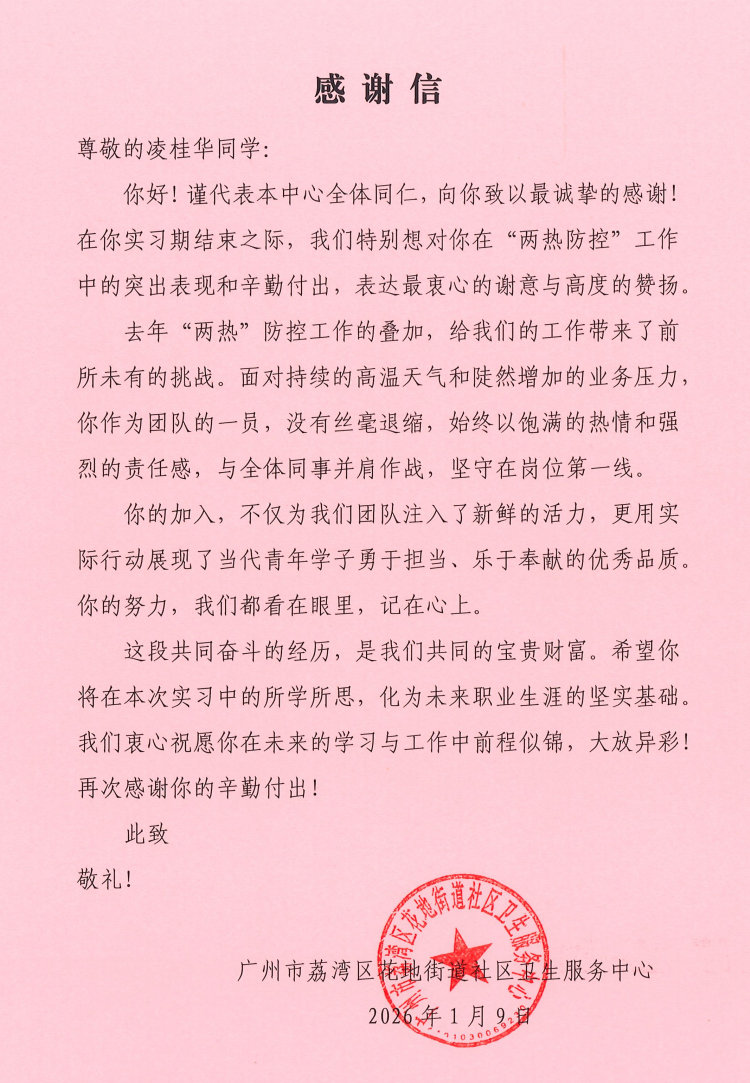 近日,廣州市荔灣區(qū)花地街道社區(qū)衛(wèi)生服務(wù)中心正式向我校中醫(yī)藥學(xué)院發(fā)來(lái)三封感謝信,對(duì) 2023 級(jí)實(shí)習(xí)生李淑冰(23 中醫(yī) 17 班)、凌桂華(23 中醫(yī) 17 班)、李梓恒(23 藥學(xué) 6 班)在基層實(shí)習(xí)期間的優(yōu)異表現(xiàn)給予高度評(píng)價(jià)與特別表?yè)P(yáng),充分肯定了三位學(xué)子的職業(yè)素養(yǎng)與實(shí)踐能力。
