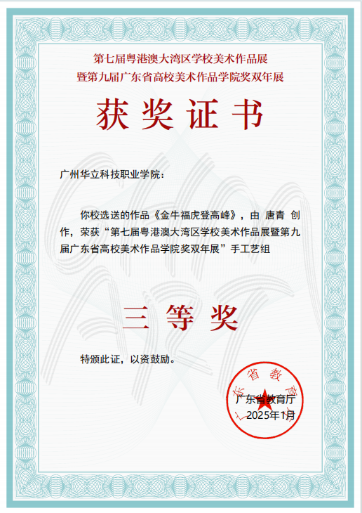 一、2025年1月,廣東省教育廳頒發(fā)了第七屆粵港澳大灣區(qū)學(xué)校美術(shù)作品展暨第九屆廣東省高校美術(shù)作品學(xué)院獎(jiǎng)雙年展的獲獎(jiǎng)證書。其中,陳艾君、黎映如、鄭黎明三位教師共同創(chuàng)作的版畫作品《篤行致遠(yuǎn)之二》榮獲“二等獎(jiǎng)”,唐青教師的作品《金牛?;⒌歉叻濉穭t榮獲“三等獎(jiǎng)”。這些榮譽(yù)不僅是對(duì)教師個(gè)人藝術(shù)造詣的高度肯定,更凸顯了學(xué)院教師在藝術(shù)創(chuàng)作上風(fēng)格多元、勇于創(chuàng)新的特質(zhì)。