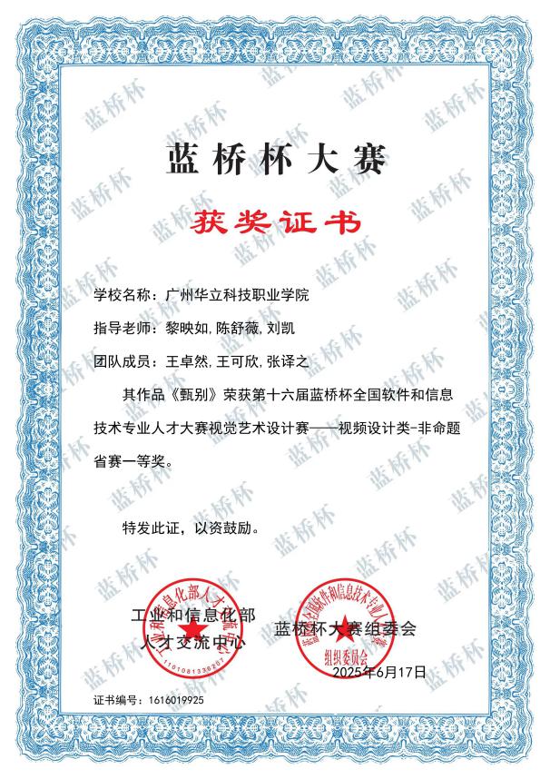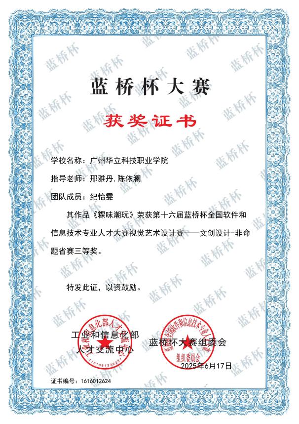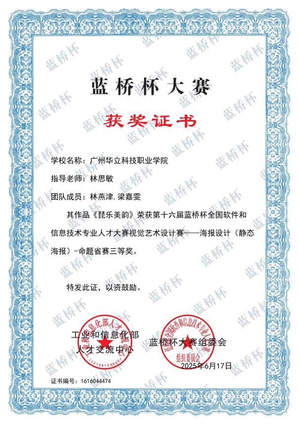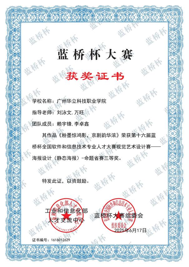四、2025年6月,“藍(lán)橋杯全國(guó)軟件和信息技術(shù)專業(yè)人才大賽”由工業(yè)和信息化部人才交流中心主辦,連續(xù)多年入選中國(guó)高等教育學(xué)會(huì)“全國(guó)普通高校學(xué)科競(jìng)賽排行榜”。本屆大賽省賽在全國(guó)31個(gè)省市自治區(qū)舉辦,來(lái)自北京大學(xué)、清華大學(xué)、復(fù)旦大學(xué)、上海交通大學(xué)等1900多所高校的23萬(wàn)名選手同臺(tái)競(jìng)技。在第十六屆“藍(lán)橋杯?視覺藝術(shù)設(shè)計(jì)大賽”藝術(shù)與傳媒學(xué)院學(xué)子斬獲“一等獎(jiǎng)”2項(xiàng)、“二等獎(jiǎng)”1項(xiàng)、“三等獎(jiǎng)”5項(xiàng)。