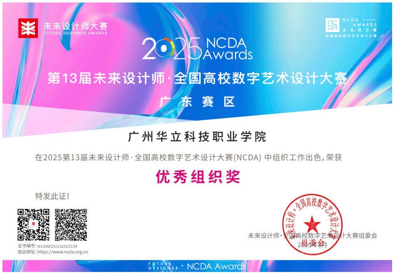 九、2025年8月,未來(lái)設(shè)計(jì)師·全國(guó)高校數(shù)字藝術(shù)設(shè)計(jì)大賽(NCDA)是入選《全國(guó)普通高校大學(xué)生競(jìng)賽排行榜》,近20家省教育廳認(rèn)定,“學(xué)習(xí)強(qiáng)國(guó)”學(xué)習(xí)平臺(tái)支持,對(duì)接聯(lián)合國(guó)國(guó)際賽的全國(guó)性大學(xué)生競(jìng)賽。是高校教育教學(xué)改革和創(chuàng)新人才培養(yǎng)的重要競(jìng)賽項(xiàng)目之一,具有極高的知名度與影響力。在第13屆未來(lái)設(shè)計(jì)師·全國(guó)高校數(shù)字藝術(shù)設(shè)計(jì)大賽(NCDA)中,藝術(shù)與傳媒學(xué)院師生在廣東省賽區(qū)共獲獎(jiǎng)12項(xiàng)。其中,我校獲得優(yōu)秀組織單位獎(jiǎng)1項(xiàng);學(xué)生組“一等獎(jiǎng)”2項(xiàng),“三等獎(jiǎng)”2項(xiàng);教師組“一等獎(jiǎng)”1項(xiàng),“三等獎(jiǎng)”1項(xiàng);“優(yōu)秀指導(dǎo)教師獎(jiǎng)”4項(xiàng);“優(yōu)秀組織教師獎(jiǎng)”1項(xiàng)。