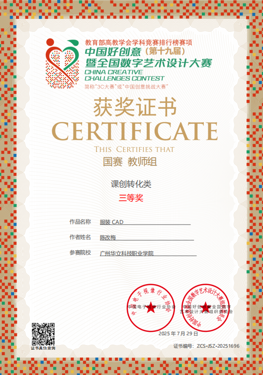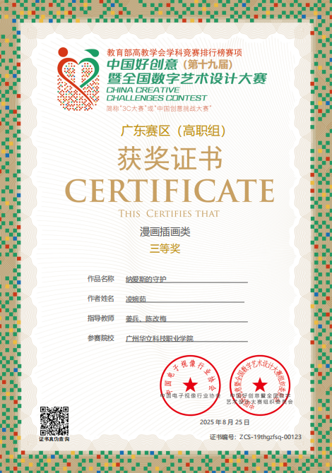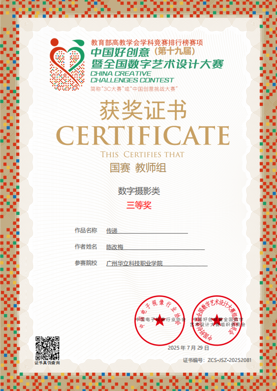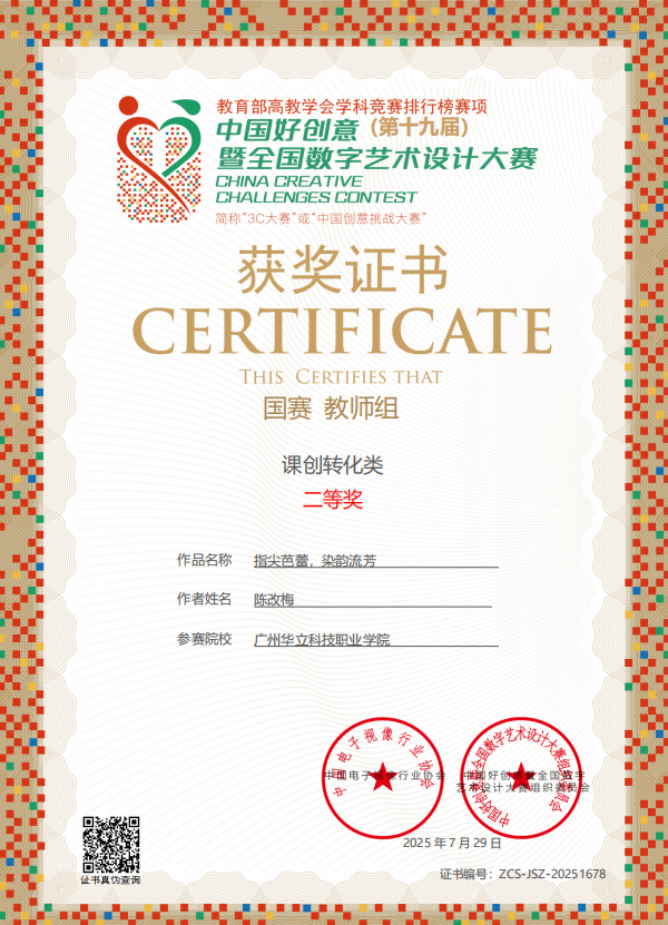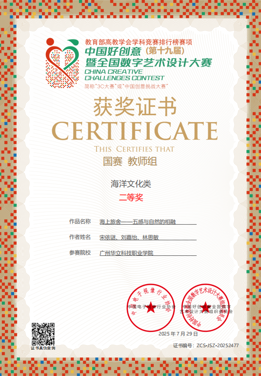 七、2025年7月,中國(guó)好創(chuàng)意暨全國(guó)數(shù)字藝術(shù)設(shè)計(jì)大賽,簡(jiǎn)稱“中國(guó)創(chuàng)意挑戰(zhàn)大賽”,是教育部中國(guó)高等教育學(xué)會(huì)《全國(guó)普通高校學(xué)科競(jìng)賽分析報(bào)告》收錄的權(quán)威賽事。作為國(guó)內(nèi)首個(gè)以數(shù)字藝術(shù)為核心、將賽事提升至哲學(xué)高度,并提供投稿免費(fèi)存證服務(wù)的專業(yè)競(jìng)賽,吸引眾多高校參與,影響力廣泛,已成為高校藝術(shù)創(chuàng)意領(lǐng)域的重要風(fēng)向標(biāo)。第十九屆中國(guó)好創(chuàng)意暨全國(guó)數(shù)字藝術(shù)設(shè)計(jì)大賽藝術(shù)與傳媒學(xué)院教師斬獲國(guó)賽“一等獎(jiǎng)”1項(xiàng)、“二等獎(jiǎng)”3項(xiàng)、“三等獎(jiǎng)”4項(xiàng)的優(yōu)異成績(jī)。充分彰顯我校教師在數(shù)字藝術(shù)創(chuàng)作、技術(shù)應(yīng)用與教學(xué)改革中的綜合實(shí)力。