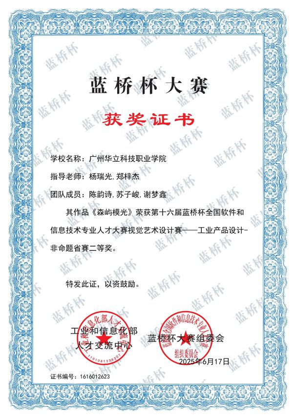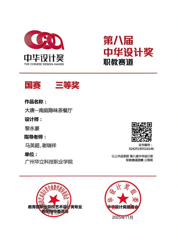 二、2025年4月,由廣東省教育廳主辦、廣州番禺職業(yè)技術(shù)學(xué)院承辦的2024—2025學(xué)年廣東省職業(yè)院校技能大賽環(huán)境藝術(shù)設(shè)計(jì)賽項(xiàng),藝傳學(xué)子謝梁英、鐘曉婷、謝志煒、黎永豪在馬英超、謝瑞祥老師指導(dǎo)下,最終在全省65支參賽隊(duì)伍、200多名選手中脫穎而出,榮獲“三等獎(jiǎng)”。