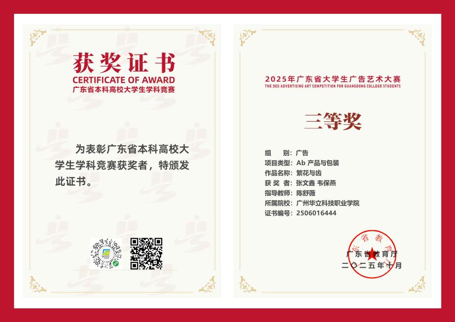 六、2025年7月,“全國(guó)大學(xué)生廣告藝術(shù)大賽”作為國(guó)內(nèi)規(guī)模龐大、覆蓋面廣、極具影響力的高校文科競(jìng)賽,始終致力于激發(fā)大學(xué)生的創(chuàng)新活力與實(shí)踐能力。2025年第17屆全國(guó)大學(xué)生廣告藝術(shù)大賽(大廣賽)廣東賽區(qū)藝術(shù)與傳媒學(xué)院選送作品中《繁花與齒》在產(chǎn)品與包裝設(shè)計(jì)類別中脫穎而出,其創(chuàng)意構(gòu)思與視覺呈現(xiàn)獲得了賽事評(píng)委的高度認(rèn)可,成功斬獲省級(jí)“三等獎(jiǎng)”。
