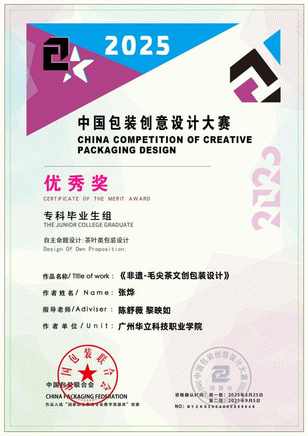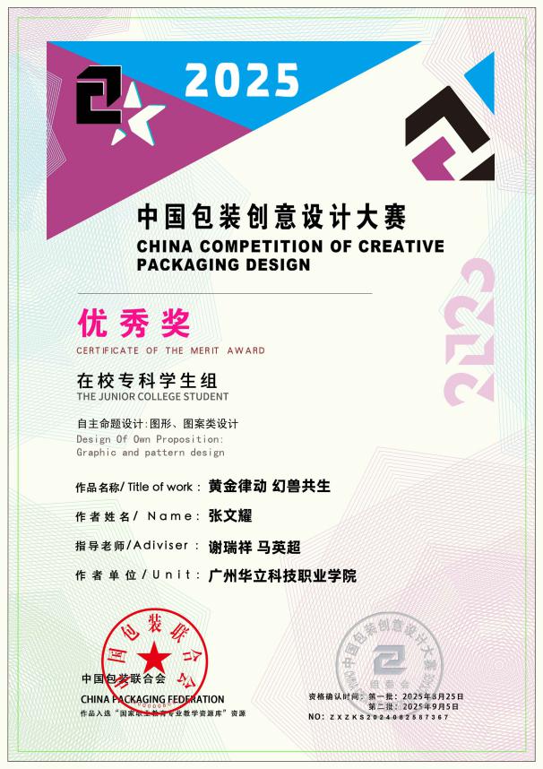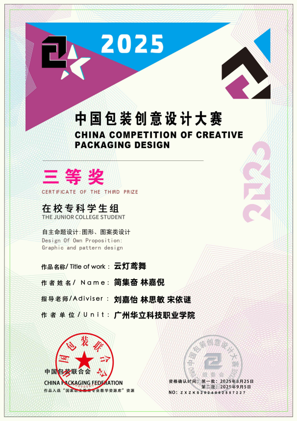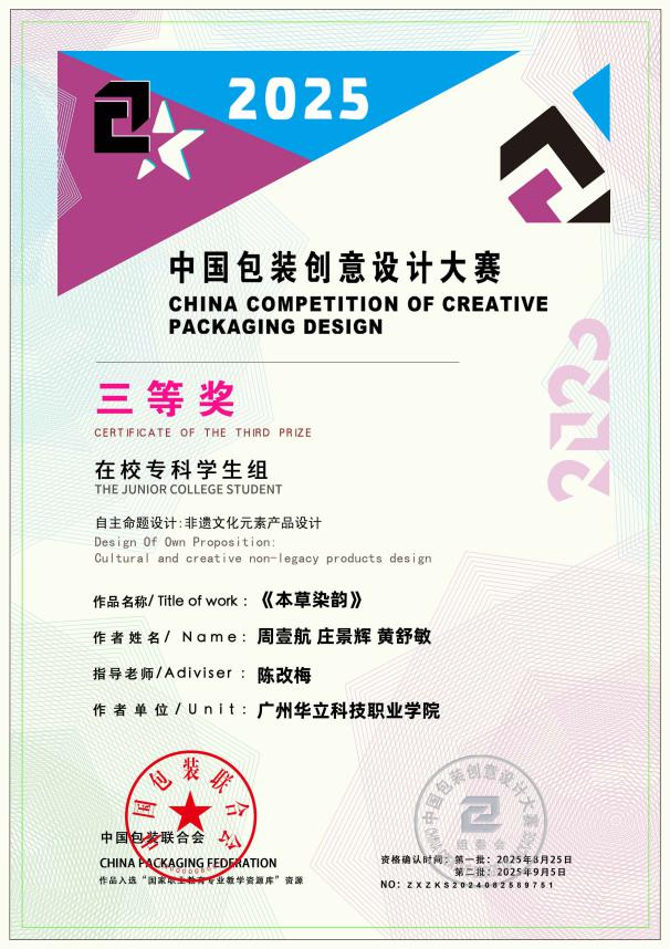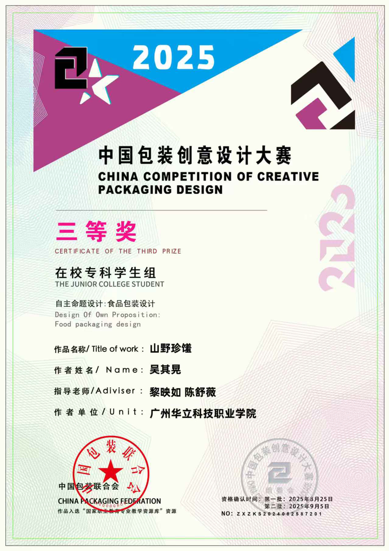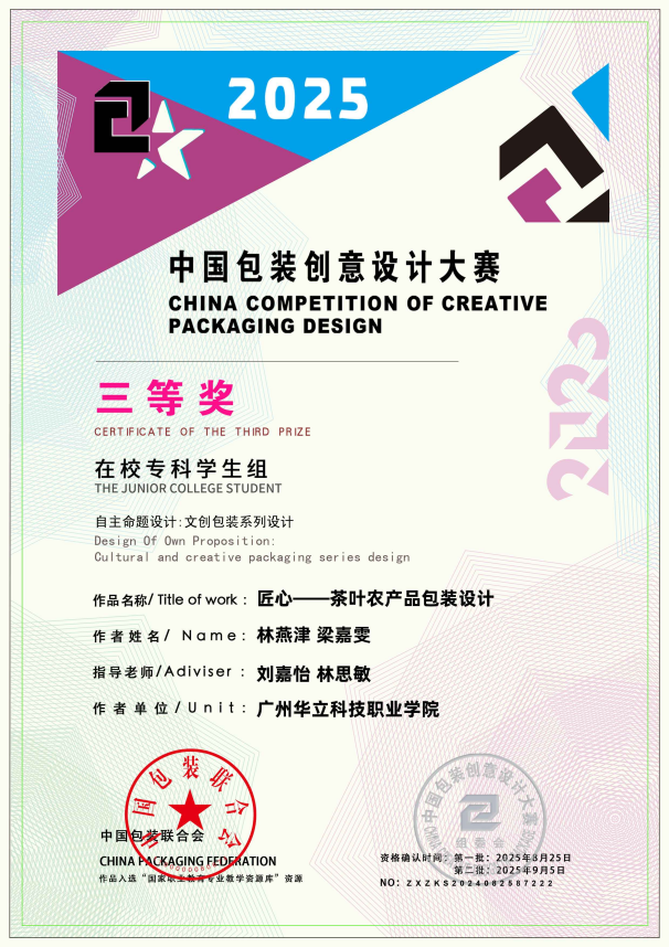 八、2025年8月,中國(guó)包裝創(chuàng)意設(shè)計(jì)大賽是由中國(guó)包裝聯(lián)合會(huì)主辦的國(guó)家級(jí)權(quán)威賽事,涵蓋工業(yè)生產(chǎn)、行業(yè)標(biāo)準(zhǔn)、包裝教育、智能制造與先進(jìn)設(shè)計(jì)等多個(gè)領(lǐng)域,面向全球設(shè)計(jì)愛好者及院校師生,已成為我國(guó)包裝與設(shè)計(jì)教育界具有廣泛影響力的專業(yè)競(jìng)賽平臺(tái)。大賽優(yōu)秀作品亦納入教育部國(guó)家職業(yè)教育專業(yè)教學(xué)資源庫(kù)建設(shè)。2025中國(guó)包裝創(chuàng)意設(shè)計(jì)大賽,藝術(shù)與傳媒學(xué)院學(xué)生作品共斬獲國(guó)家級(jí)“三等獎(jiǎng)”5項(xiàng)、“優(yōu)秀獎(jiǎng)”6項(xiàng),充分展現(xiàn)了藝術(shù)與傳媒學(xué)院在設(shè)計(jì)教育與創(chuàng)新實(shí)踐方面的扎實(shí)成效。