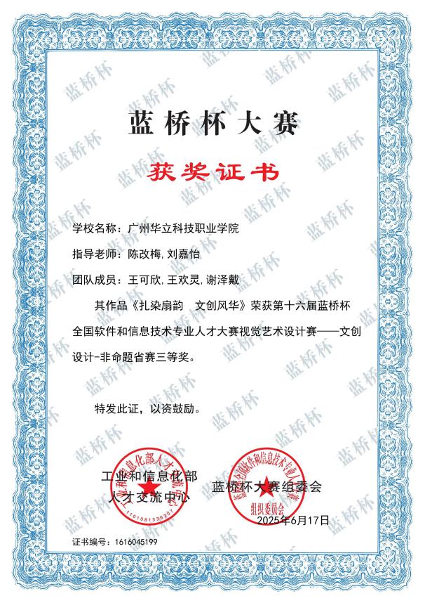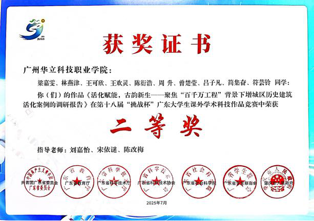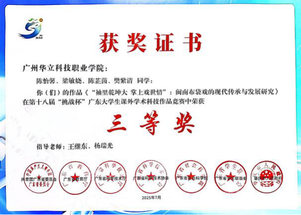 五、2025年7月,在廣東省第十八屆“挑戰(zhàn)杯”大學(xué)生課外學(xué)術(shù)科技作品競(jìng)賽決賽中,藝傳師生斬獲“挑戰(zhàn)杯”省賽“二等獎(jiǎng)”1項(xiàng),“三等獎(jiǎng)”1項(xiàng),充分展現(xiàn)了藝傳學(xué)院青年學(xué)子以專業(yè)所學(xué)服務(wù)鄉(xiāng)村振興戰(zhàn)略的責(zé)任擔(dān)當(dāng)與創(chuàng)新實(shí)踐,更展現(xiàn)了學(xué)校以產(chǎn)教融合助力“百千萬(wàn)工程”的積極實(shí)踐,助力嶺南文化名片在新時(shí)代綻放光彩。