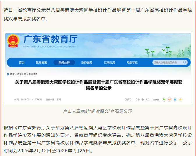 本屆賽事以“設(shè)計賦能·灣區(qū)共融”為主題,賽事旨在推進大灣區(qū)建設(shè),深化粵港澳藝術(shù)教育交流,搭建三地師生深度互動平臺,增強青年學(xué)子的文化認(rèn)同感與社會責(zé)任感。本次獲獎作品覆蓋面廣、精品度高,涵蓋工藝、環(huán)境設(shè)計、視覺傳達、數(shù)字媒體藝術(shù)、包裝設(shè)計等多個領(lǐng)域,全方位展現(xiàn)了學(xué)院師生多元的創(chuàng)作視野與扎實的專業(yè)功底。