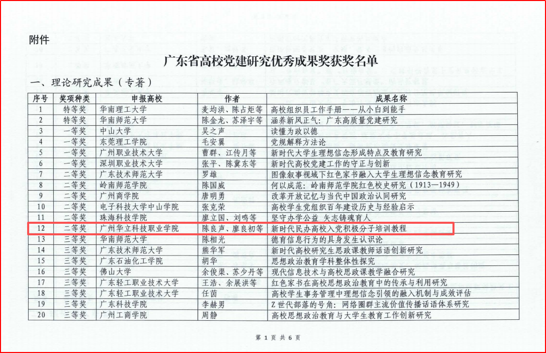 廣州華立科技職業(yè)學院榮獲廣東省高校黨建研究優(yōu)秀成果獎二等獎