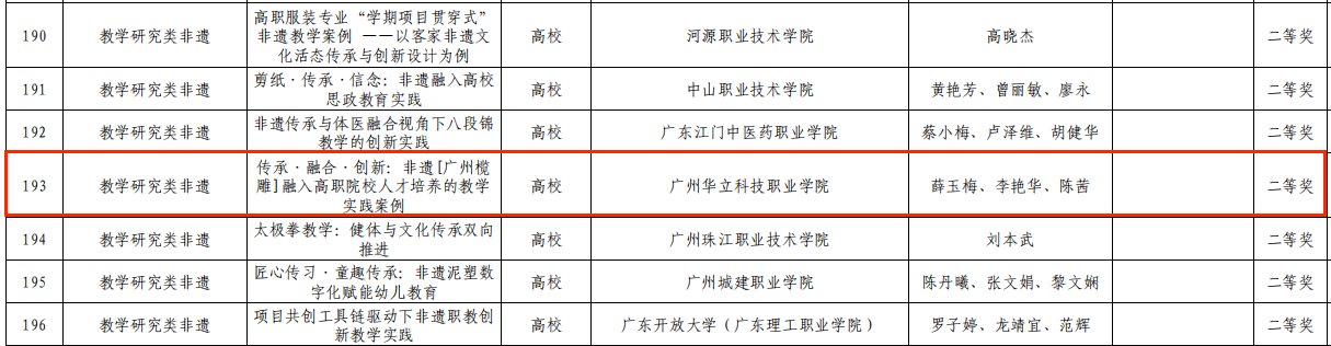 近日,廣東省教育廳公布了廣東省學(xué)校非物質(zhì)文化遺產(chǎn)項(xiàng)目交流展示活動(dòng)獲獎(jiǎng)名單,我校申報(bào)的教學(xué)研究類非遺案例 《傳承·融合·創(chuàng)新:非遺“廣州欖雕”融入高職院校人才培養(yǎng)的教學(xué)實(shí)踐案例》 以教學(xué)模式創(chuàng)新與育人成效顯著,在全省眾多參評(píng)項(xiàng)目中脫穎而出,榮獲高校組教學(xué)研究類非遺案例二等獎(jiǎng)。